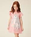 Vestido infantil fantasia, ideal para meninas de 04 até 10 anos de idade, confeccionado em malha algodão com sobreposição de tule com aplicação de brilho. Possui estampa Unicórnio, decote redondo, manga curta, acabamento e costura no tom.