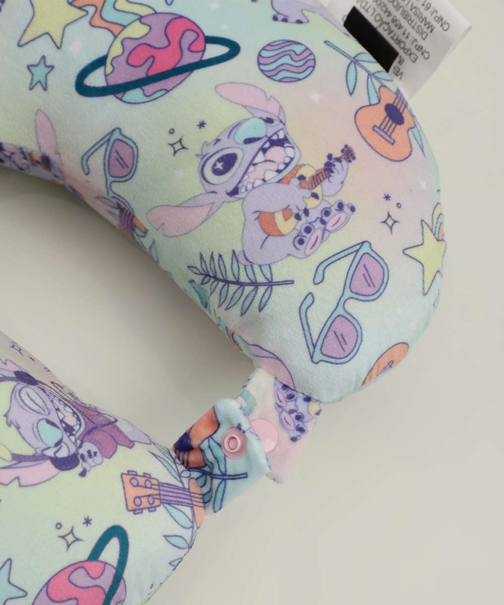 Almofada de pescoço com formato curvo para apoiar a cabeça e o pescoço, confeccionada em tecido poliéster. Possui estampa Stitch personagem da Disney, enchimento em espuma sintética, que proporciona conforto e bem estar ao sono, fechamento por botão e alça para transporte.