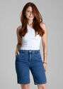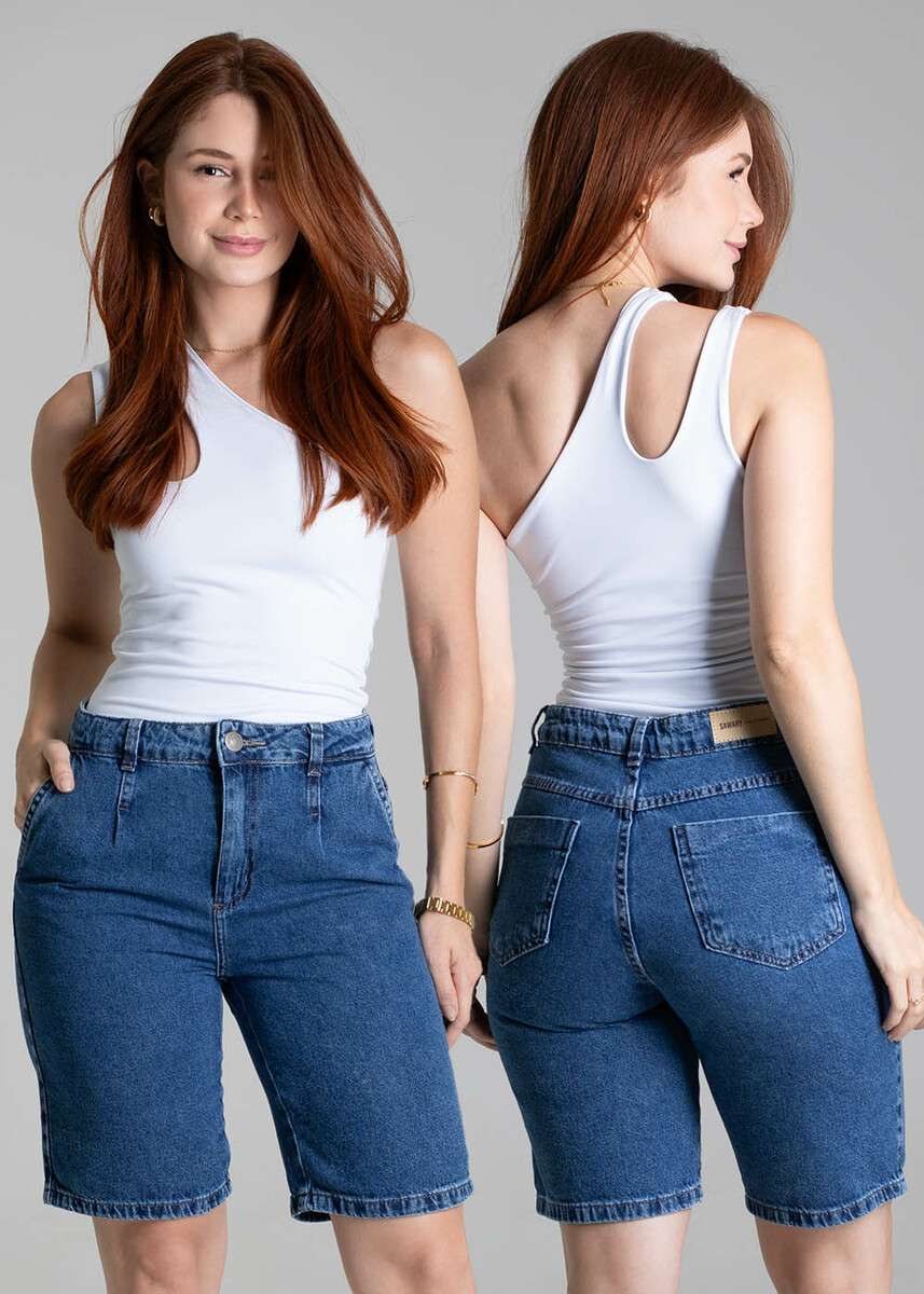 Bermuda confeccionado em jeans. Modelagem moderna e confortável para todas as ocasiões. Cintura alta Fechamento com botão e zíper Bolsos frontais faca posterior funcionais Barra simples Tecido: Jeans Tipo de lavagem: Azul Cor: Azul médio