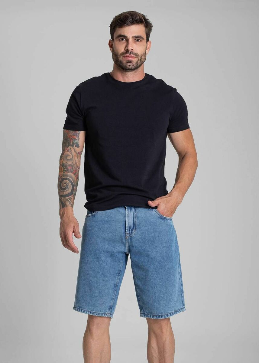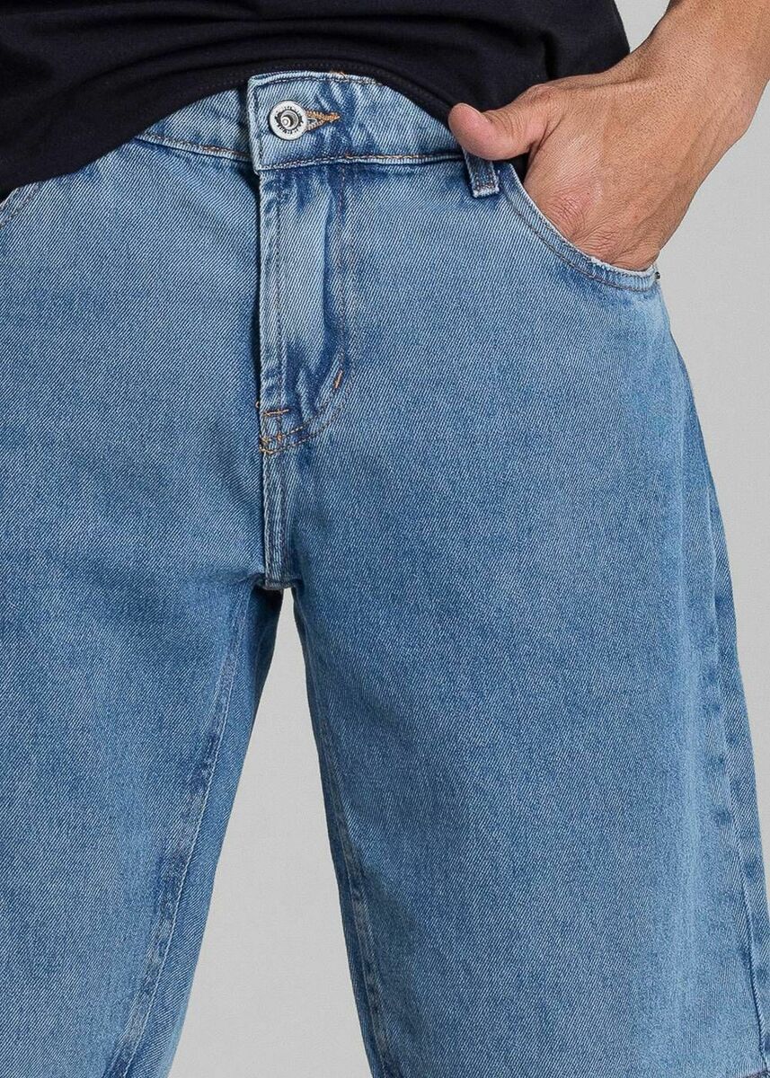 Bermuda masculino confeccionada em jeans. Modelagem moderna e confortável. Cintura média Comprimento médio Fechamento com botão metálico e zíper Bolsos frontais e traseiros funcionais Barra simples Modelagem: Men bermuda Tecido: Jeans Tipo de lavagem: Azul Cor: Azul