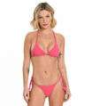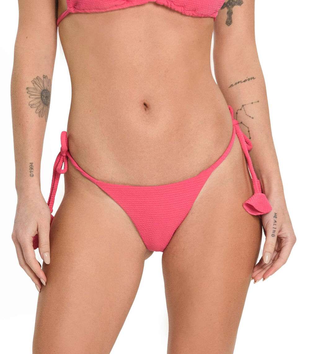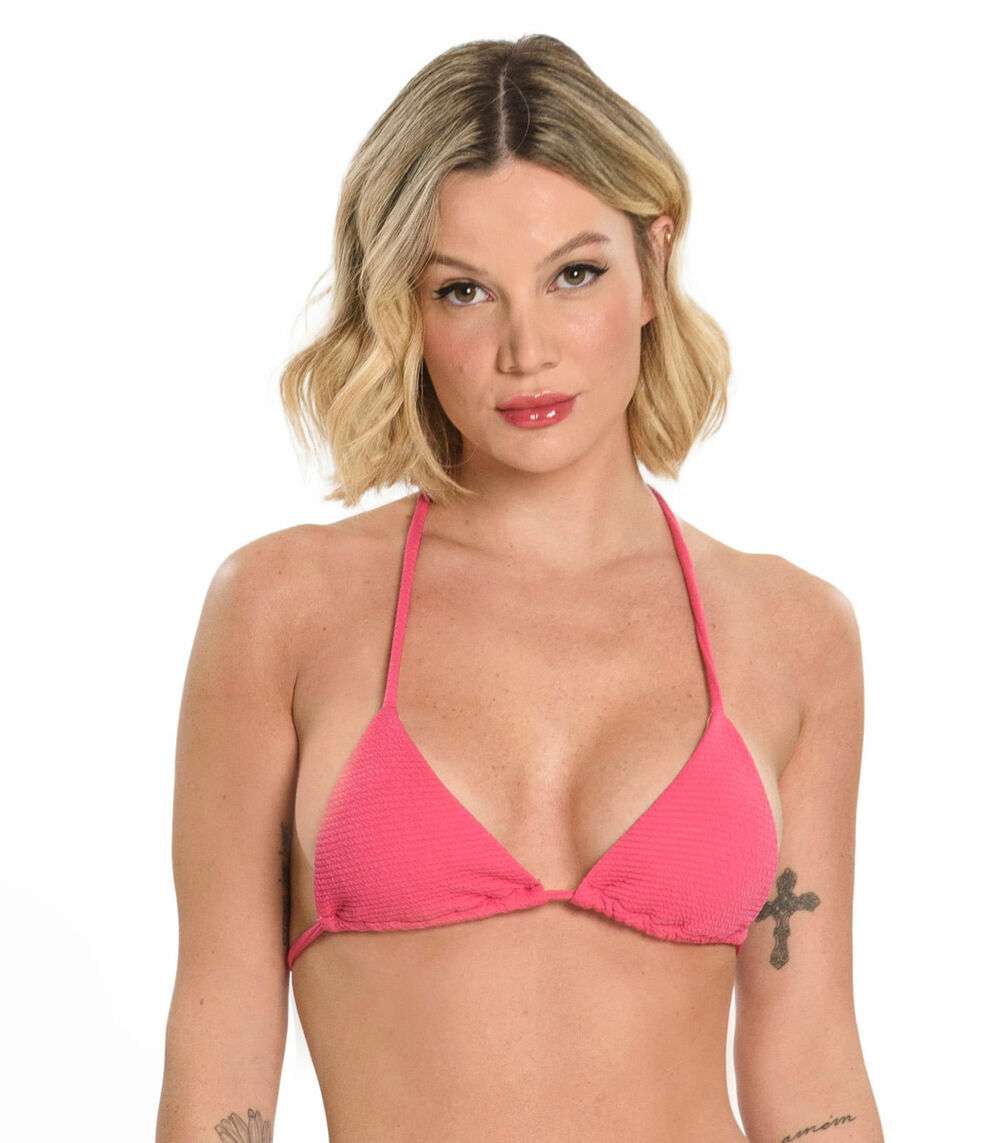 Biquíni modelo cortininha desenvolvido em Poliéster. Parte de cima possui bojo removível e alças de amarrar nos ombros e costas, com detalhe nas pontas. Parte de baixo possui fio duplo com elástico, causando um efeito empinado, e friso para amarração nas laterais com detalhe nas pontas. Modelo confortável e estiloso para você arrasar nesse verão.
