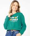 Blusão feminino, modelo cropped, confeccionado em malha moletom com forro flanelado. Possui estampa frontal de frase, manga longa, acabamento em ribana costura no tom.