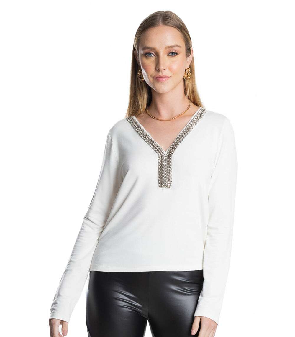 O Blusão Feminino Rovitex é confeccionado em Molecotton de Viscose, oferecendo conforto e durabilidade. Possui decote V com aplicação de aviamento, manga longa e leve degrau que alonga a peça atrás, dando um toque elegante. Ideal para complementar seus looks do dia a dia.