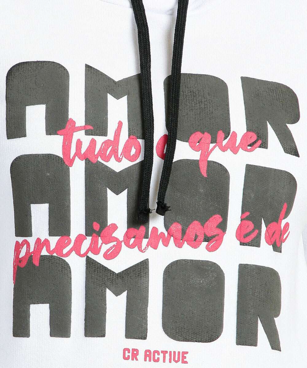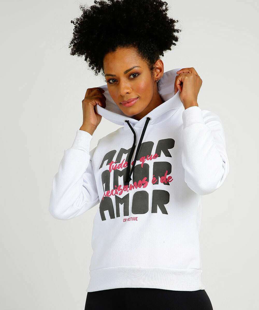 Blusão feminino confeccionado em tecido moletom com forro flanelado. Possui capuz com ajuste, manga longa, estampa com frase, acabamento em ribana e costura no tom.