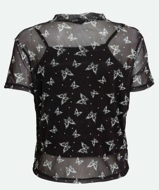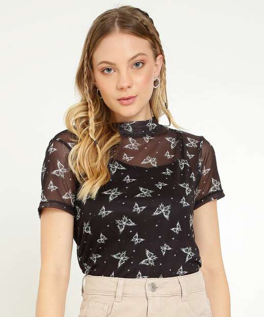 Blusa Feminina Tule Borboletas Manga Curta Marisa