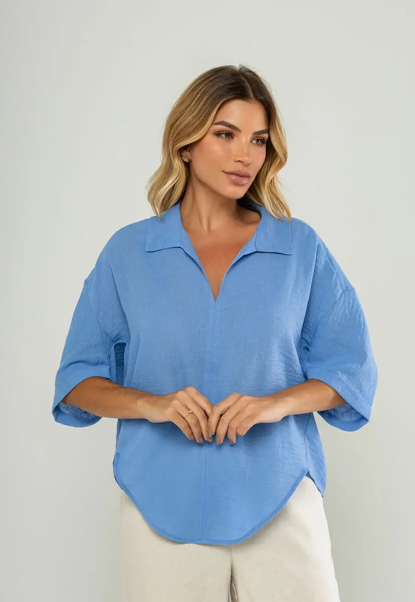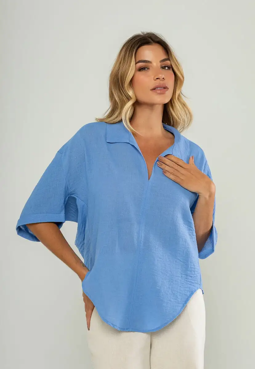 A blusa feminina com gola meia polo é a escolha perfeita para quem busca estilo, conforto e versatilidade em uma única peça. Confeccionada em tecido leve, ela oferece um caimento fluido que veste com elegância e proporciona frescor ao longo do dia.Seu design moderno conta com gola meia polo, que traz um toque contemporâneo e sofisticado ao visual, além de uma abertura frontal discreta que alonga a silhueta. A modelagem é soltinha, ideal para garantir mobilidade e conforto sem perder o charme.As mangas curtas amplas possuem recorte caído, oferecendo um visual mais despojado e atual. A barra arredondada, levemente mais longa nas laterais, garante um caimento harmonioso e favorece diferentes tipos de corpo, permitindo combinações com calças, shorts, saias e peças de alfaiataria. • Modelagem soltinha • Gola meia polo • Abertura frontal que alonga o colo • Mangas curtas amplas com recorte caído • Barra arredondada Modelo veste tamanho P. Medidas da modelo: Altura 1,73cm | Busto 86cm | Cintura 67cm | Quadril 99cm Composição: 100% Poliéster.