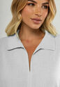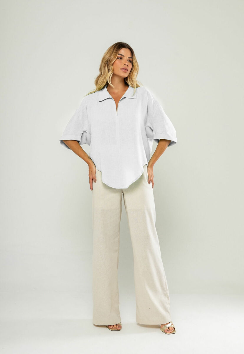 A blusa feminina com gola meia polo é a escolha perfeita para quem busca estilo, conforto e versatilidade em uma única peça. Confeccionada em tecido leve, ela oferece um caimento fluido que veste com elegância e proporciona frescor ao longo do dia.Seu design moderno conta com gola meia polo, que traz um toque contemporâneo e sofisticado ao visual, além de uma abertura frontal discreta que alonga a silhueta. A modelagem é soltinha, ideal para garantir mobilidade e conforto sem perder o charme.As mangas curtas amplas possuem recorte caído, oferecendo um visual mais despojado e atual. A barra arredondada, levemente mais longa nas laterais, garante um caimento harmonioso e favorece diferentes tipos de corpo, permitindo combinações com calças, shorts, saias e peças de alfaiataria. • Modelagem soltinha • Gola meia polo • Abertura frontal que alonga o colo • Mangas curtas amplas com recorte caído • Barra arredondada Modelo veste tamanho P. Medidas da modelo: Altura 1,73cm | Busto 86cm | Cintura 67cm | Quadril 99cm Composição: 100% Poliéster.