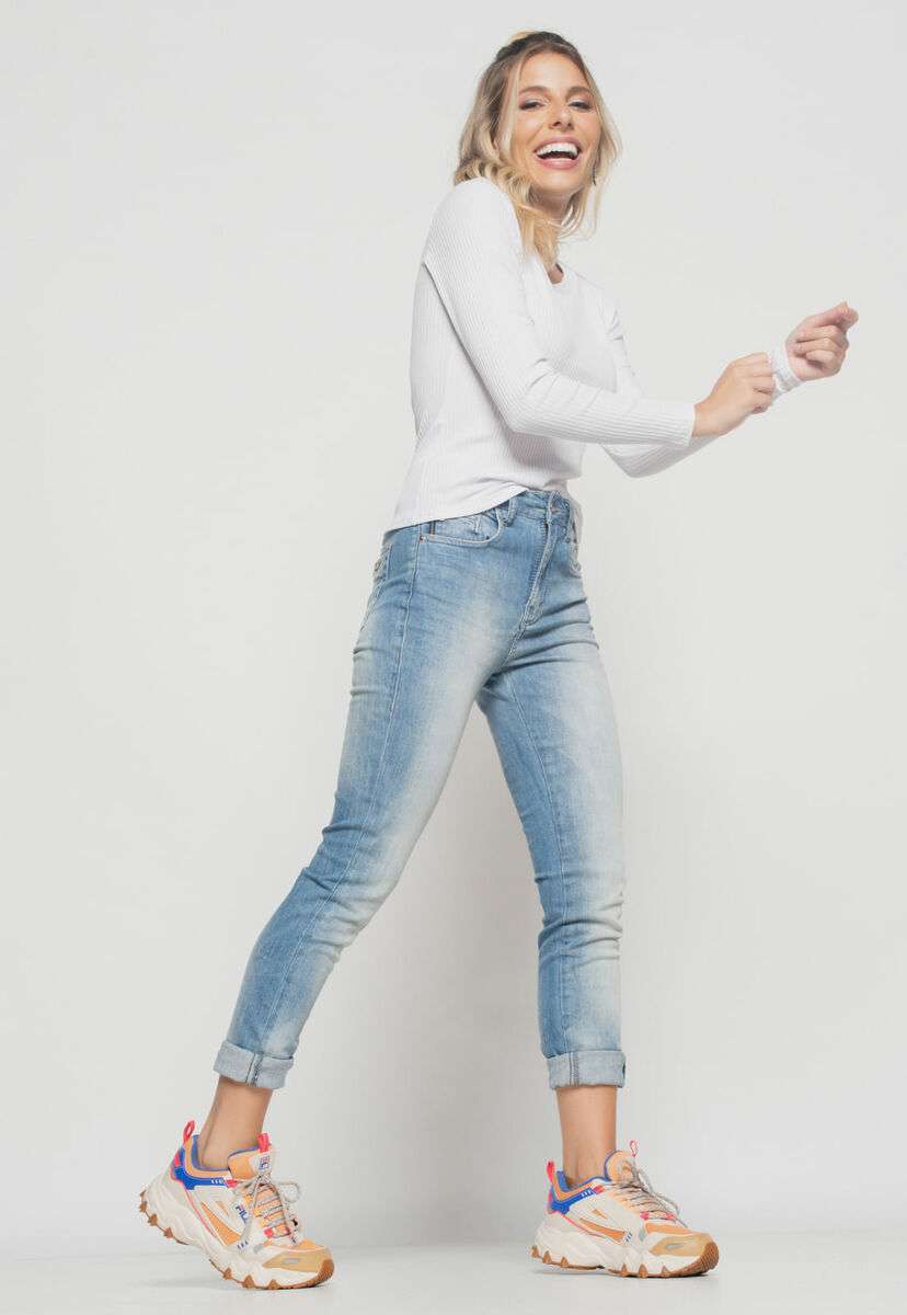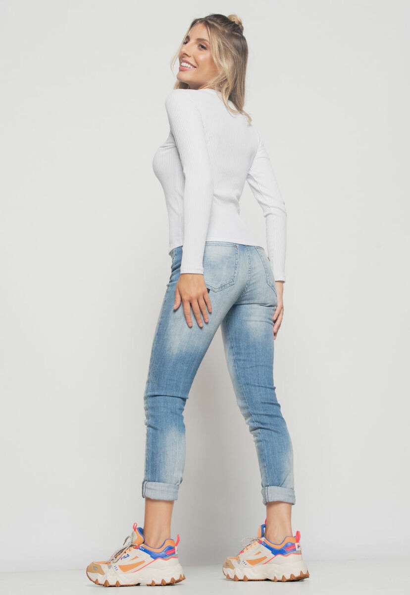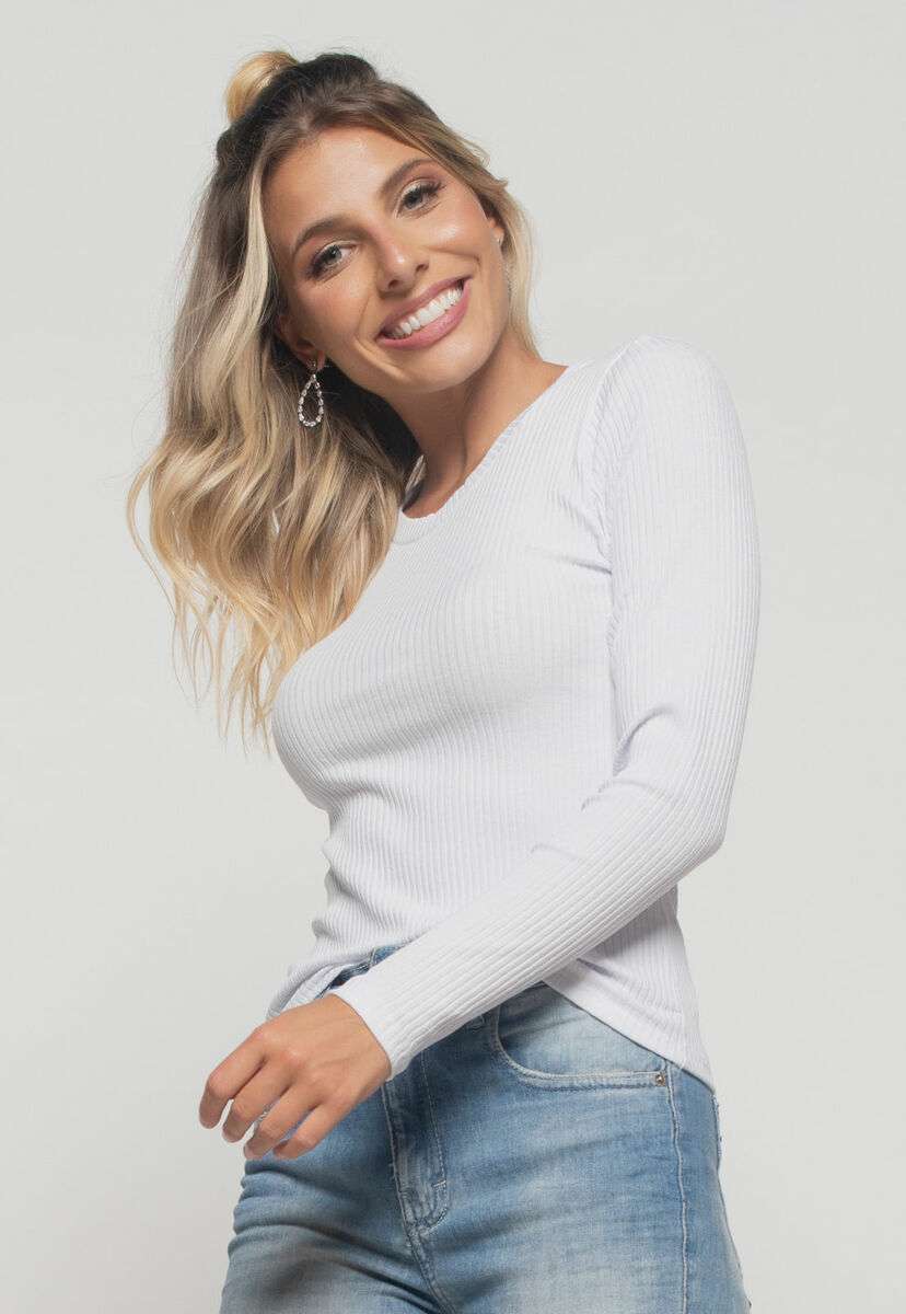 Blusa Básica Manga Longa e Gola Redonda Canelada Branco Salvatore Fashion