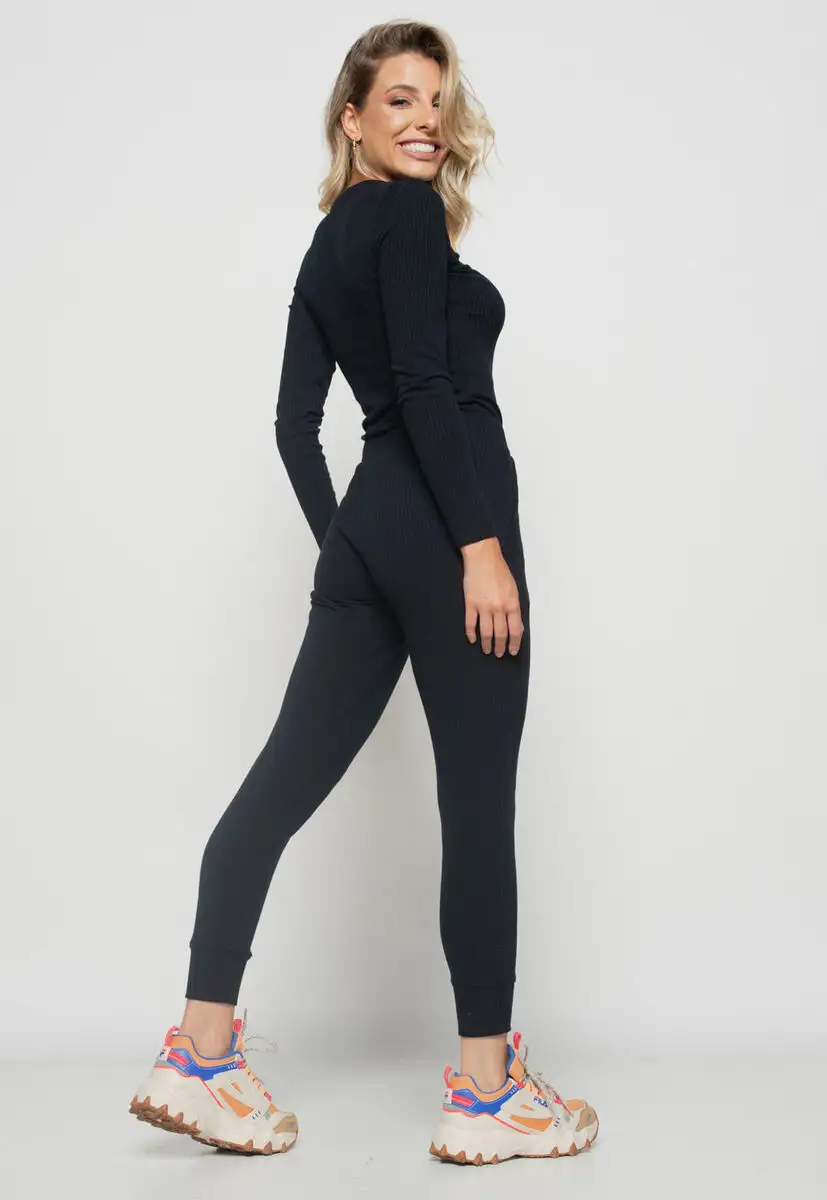 Blusa Básica Manga Longa e Gola Redonda Canelada Preta