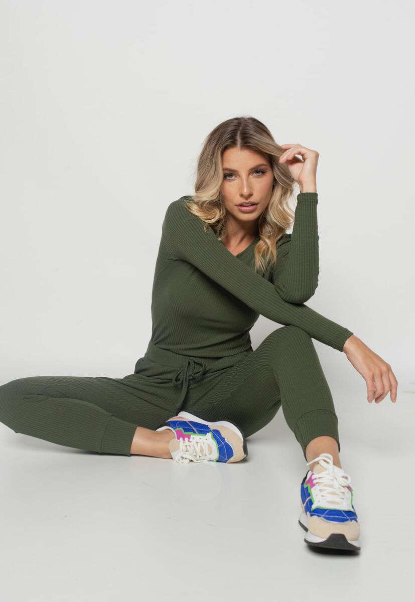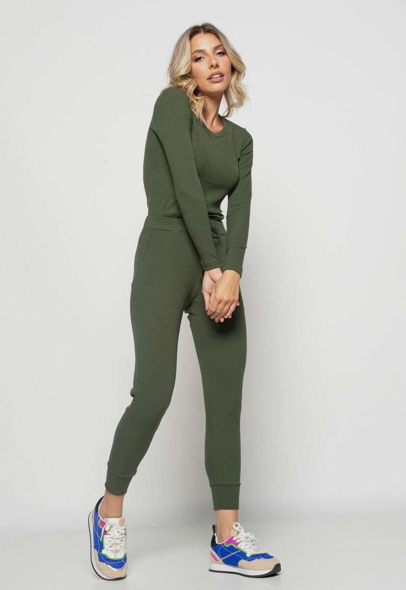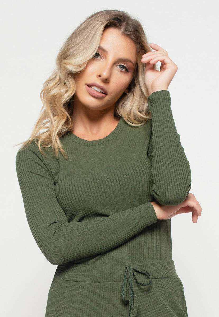 Blusa Básica Manga Longa e Gola Redonda Canelada Verde