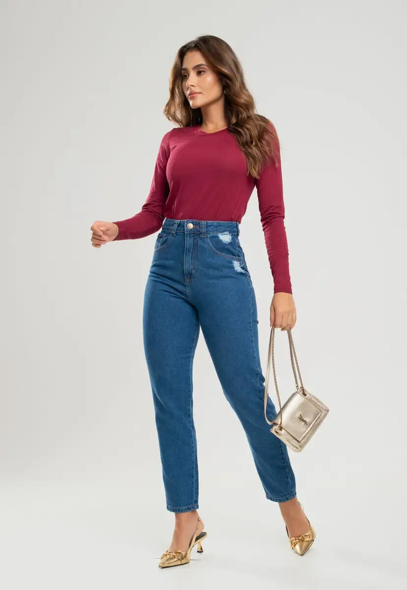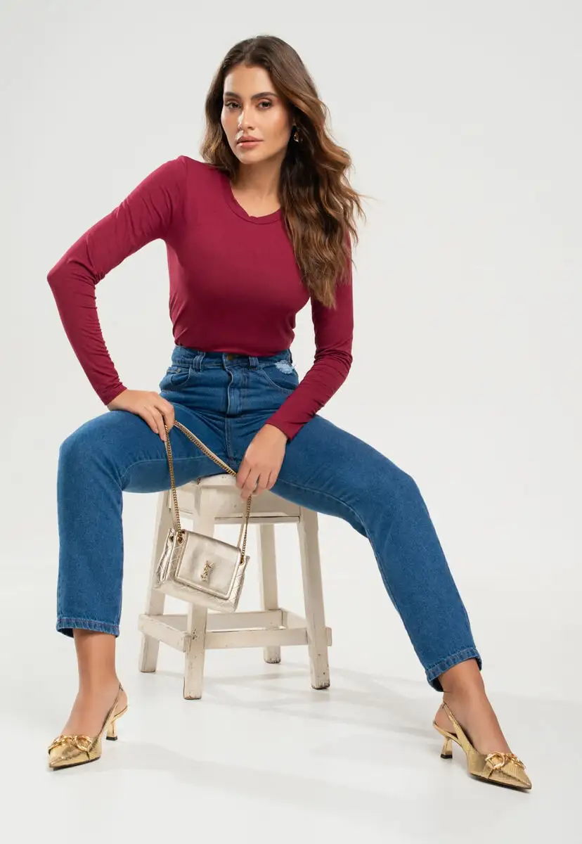 Blusa Básica Manga Longa e Gola Redonda Malha Vinho Salvatore Fashion