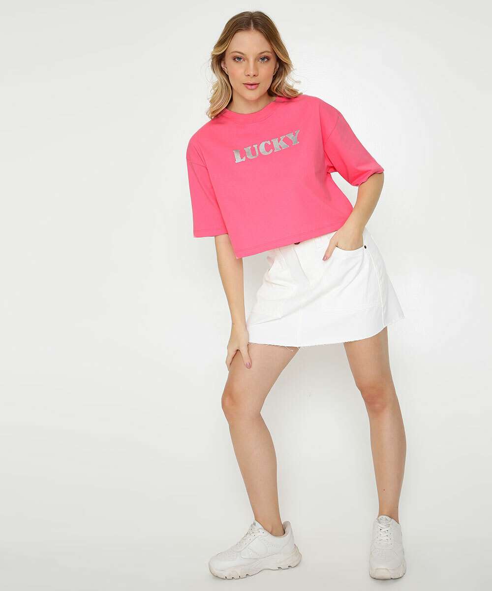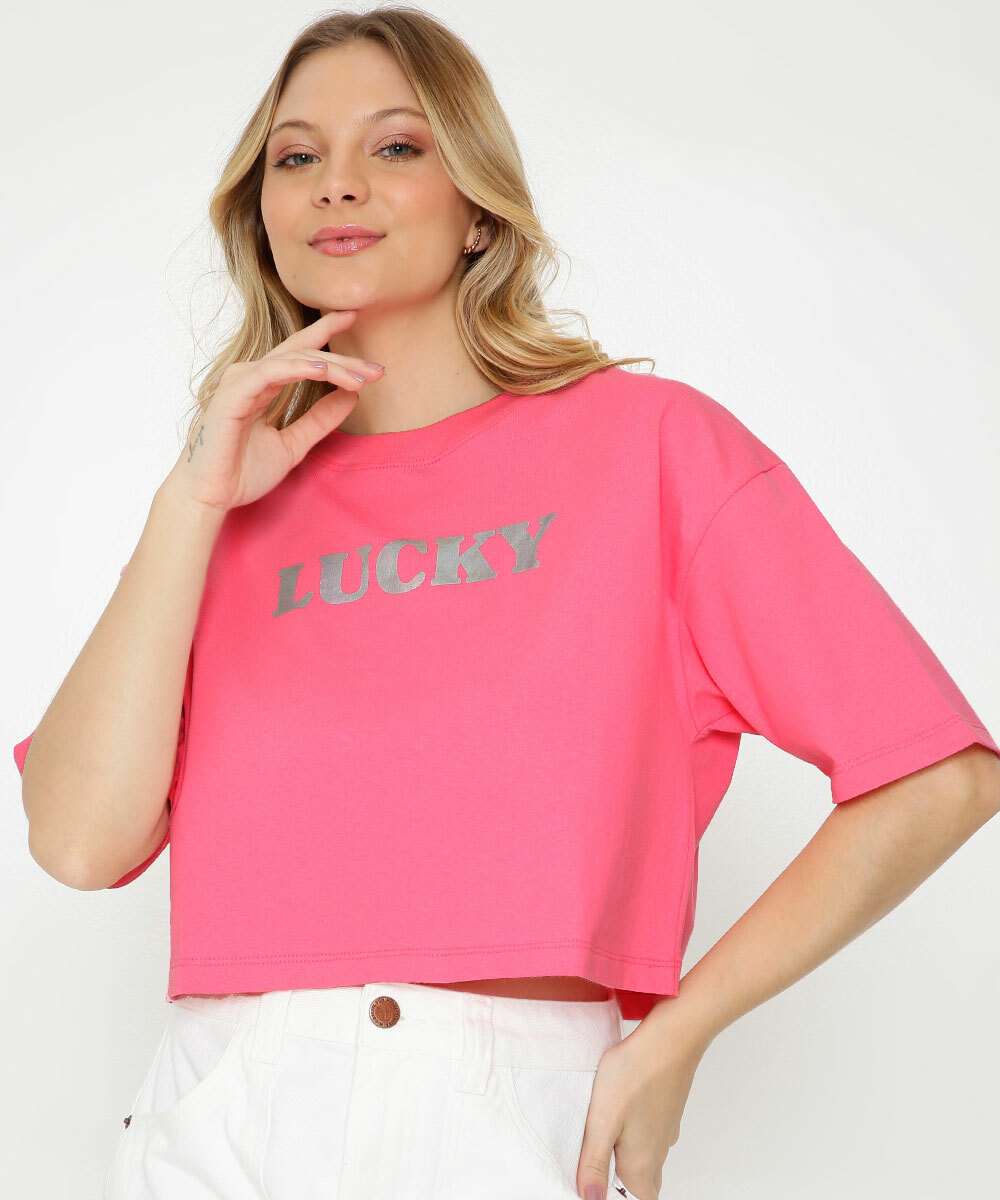 Detalhes adicionais: cropped, estampa frontal, manga curta