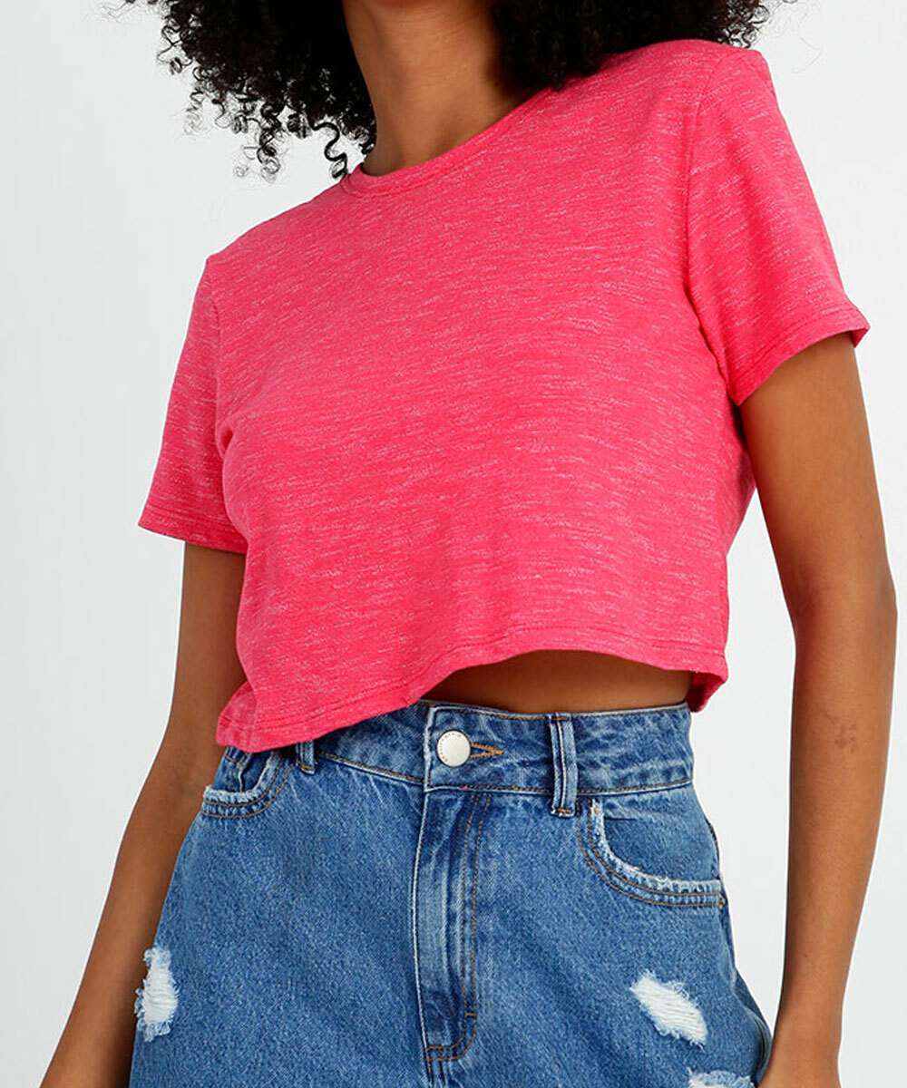 Blusa feminina, modelo cropped, confeccionada em malha flamê. Possui decote redondo, manga curta, acabamento e costura no tom.