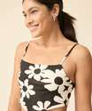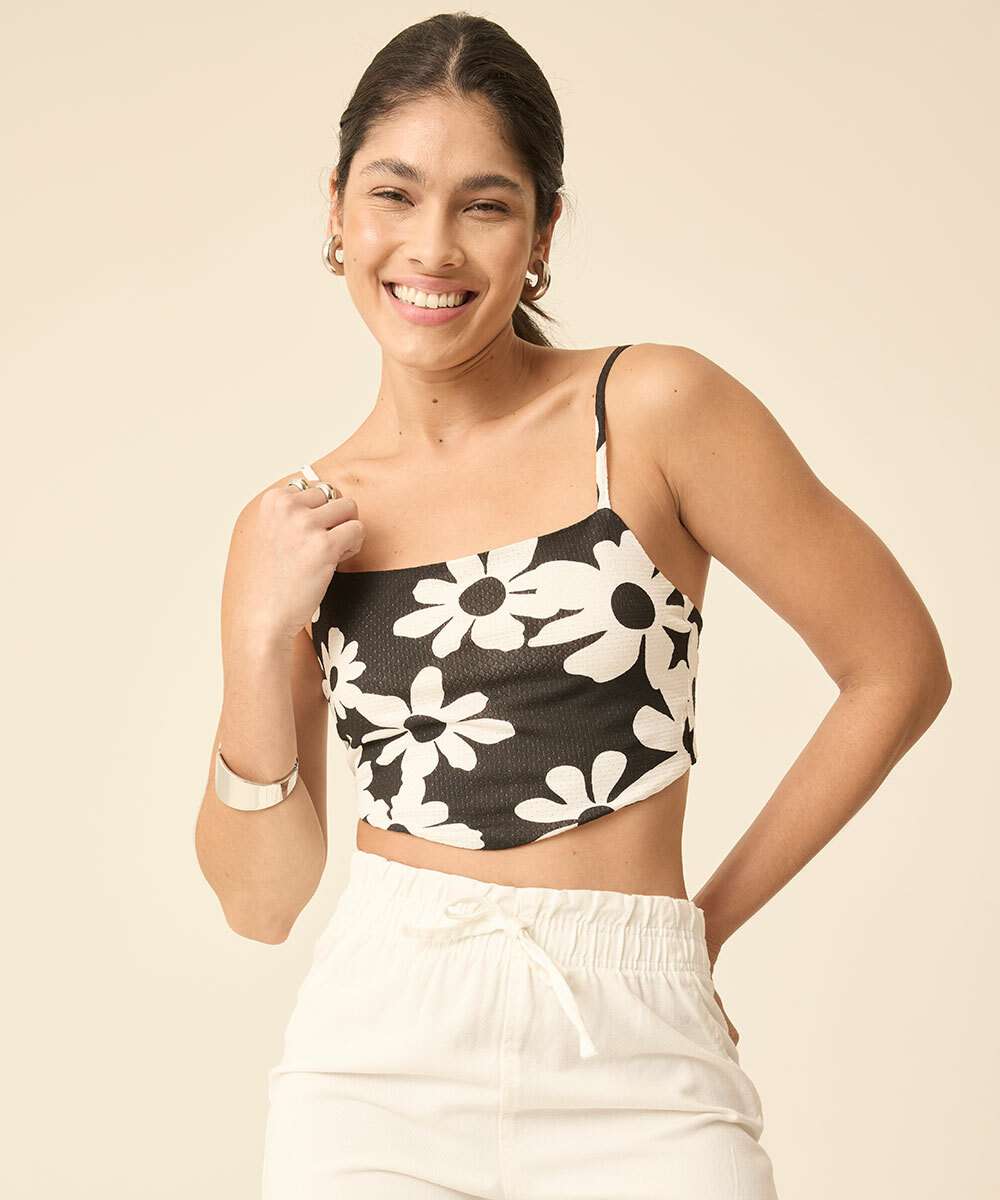 Blusa feminina, modelo cropped regata, confeccionada em tecido plano viscose e poliéster. Possui decote reto, estampa floral, alças finas, amarração na parte de trás, acabamento e costura no tom.