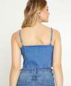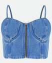 Blusa feminina, modelo cropped, confeccionada em tecido plano jeans. Possui decote reto, zíper no entremeio, alças finas, acabamento e costura no tom.