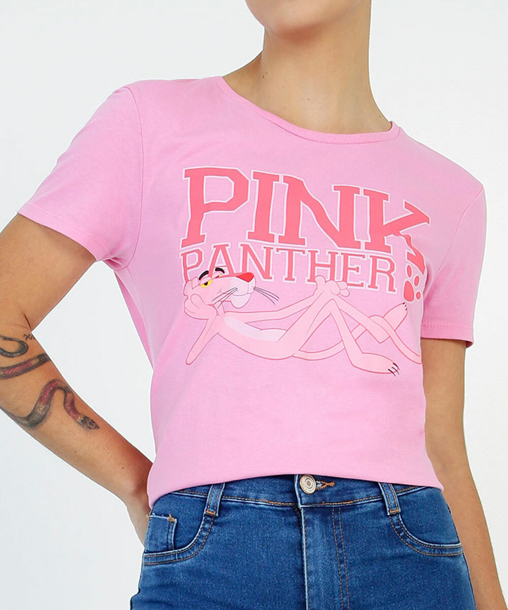 Blusa feminina, modelo cropped, confeccionada em malha algodão. Possui decote redondo, manga curta, estampa frontal Pantera Cor De Rosa, acabamento e costura no tom.