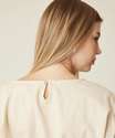 Blusa feminina, modelo cropped, confeccionada em tecido plano sarja. Possui decote redondo, manga curta bufante com elástico, barra com elástico, vazado na parte de trás com fechamento por botão, acabamento e costura no tom.