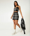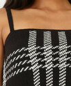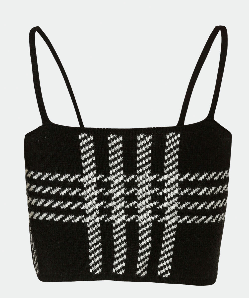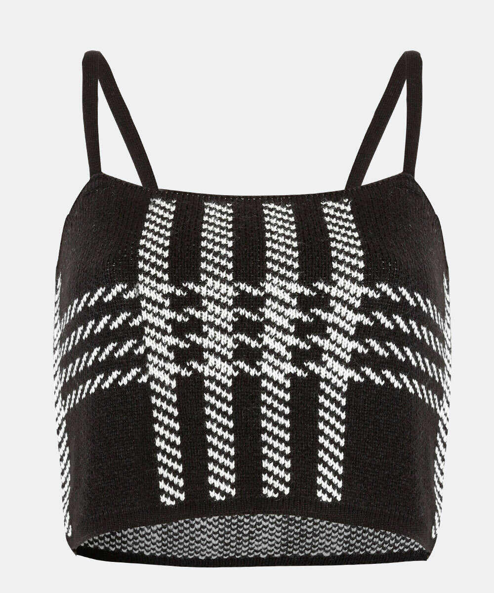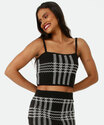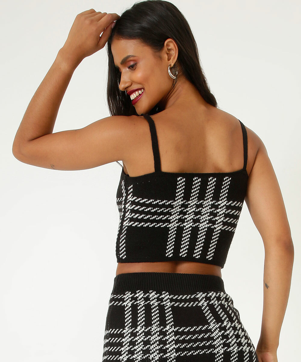 Blusa feminina, modelo cropped, confeccionada em malha tricô com padronagem pied poule. Possui decote reto, alças finas, acabamento e costura no tom.