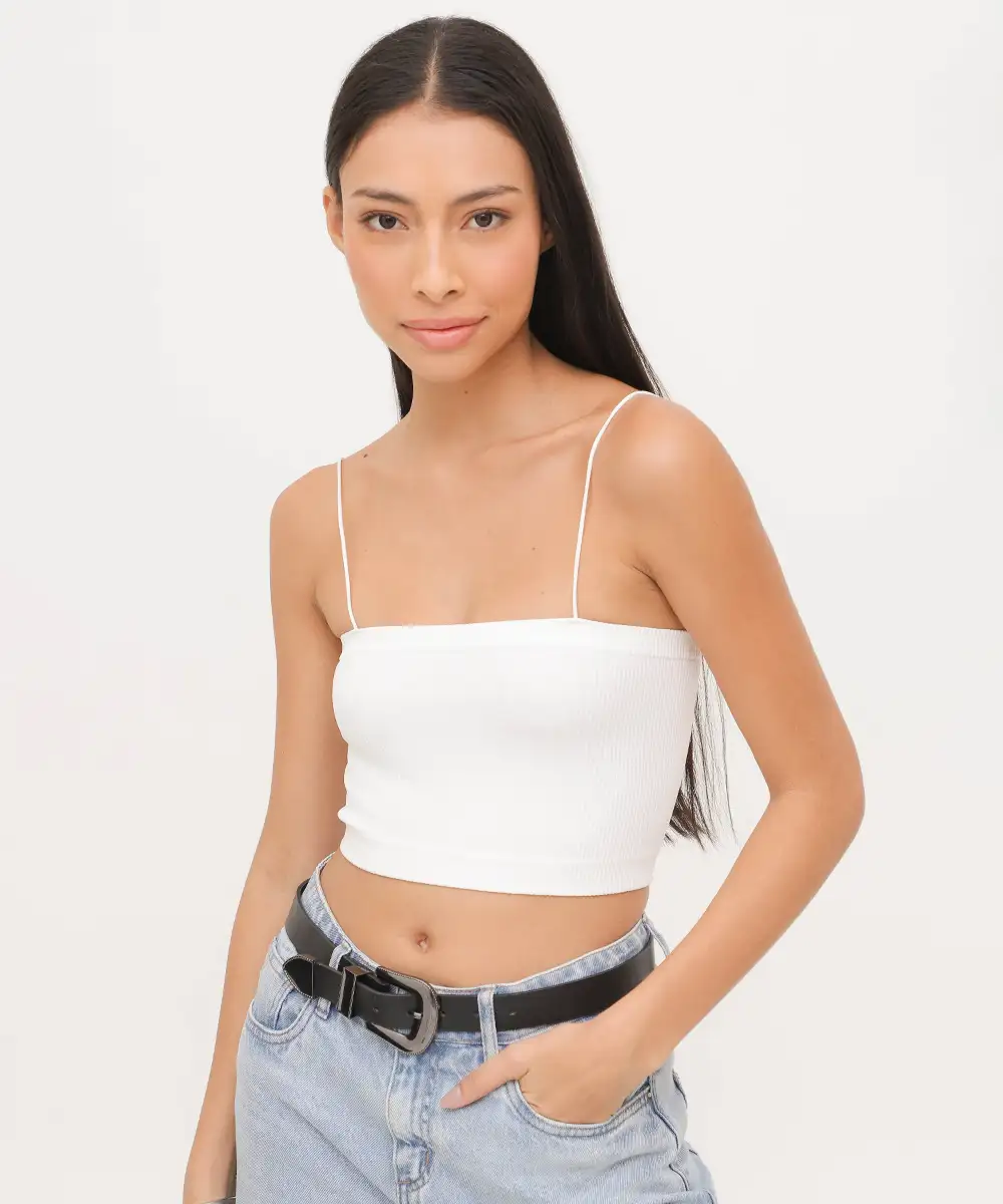 Blusa feminina, modelo cropped regata, alças finas, decote quadro e detalhes com brilho.