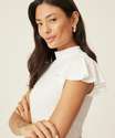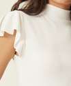 Blusa feminina confeccionada em malha canelada. Possui gola alta, manga curta com babado, acabamento e costura no tom.