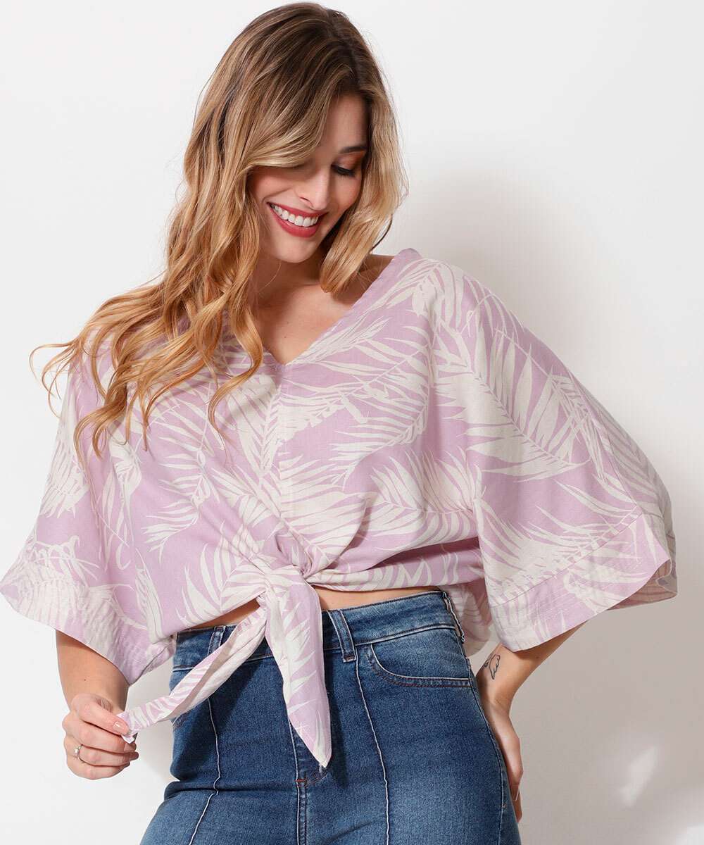 Blusa feminina, confeccionada em tecido plano algodão, viscose e linho. Possui decote v, estampa de folhas, manga 3/4, barra com amarração, acabamento e costura no tom.