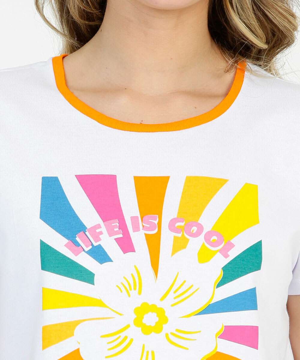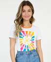 Blusa feminina, confeccionada em malha algodão. Possui estampa frontal, decote redondo, manga curta, acabamento e costura no tom.