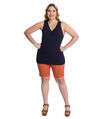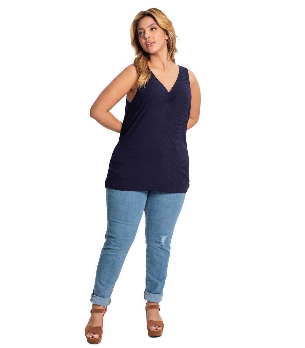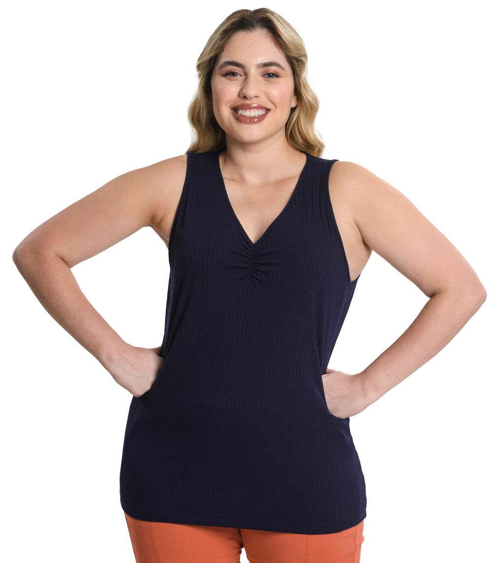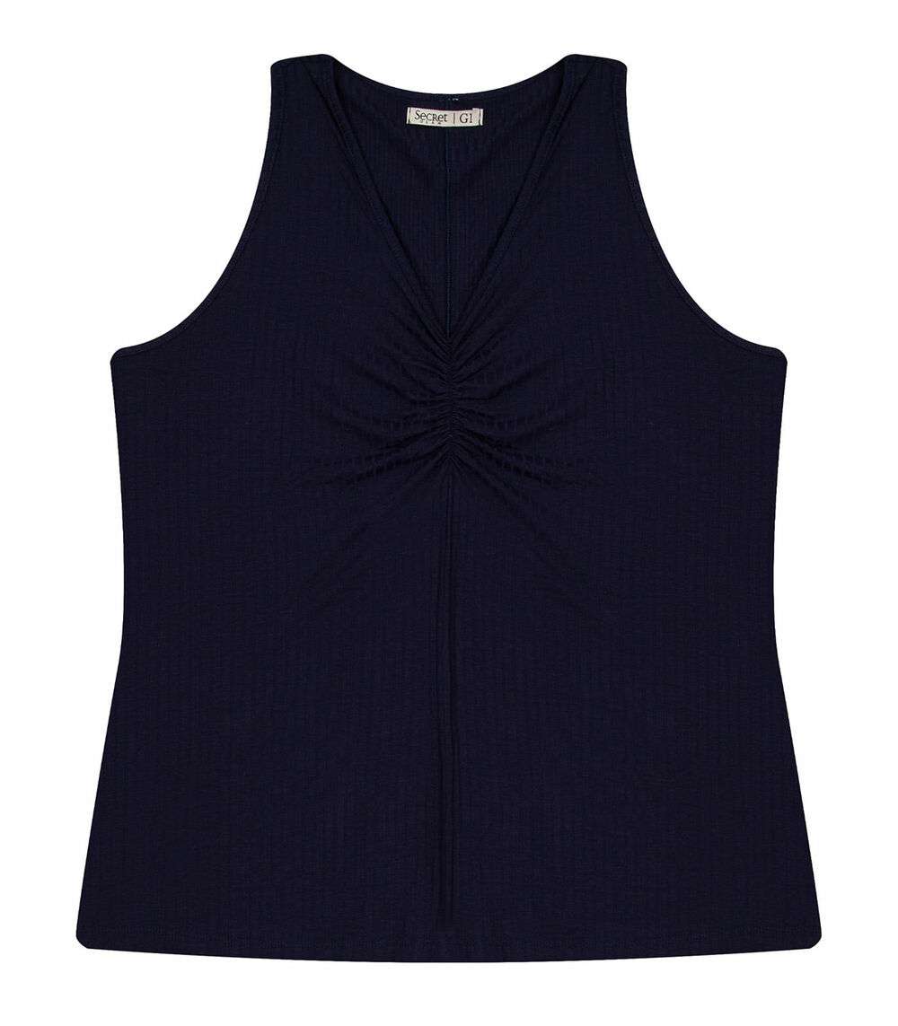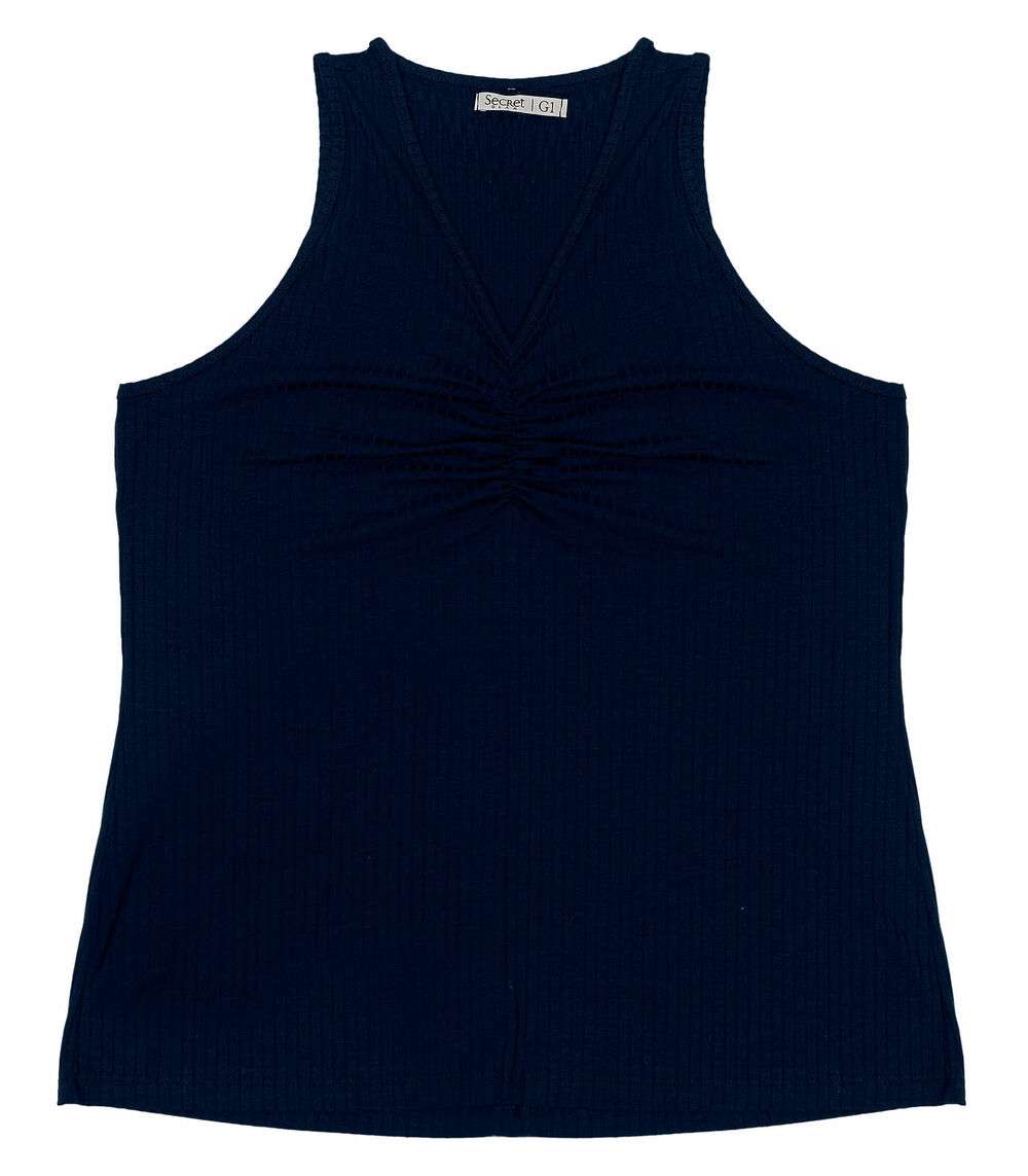 A Blusa Feminina Plus Size Canelada Secret Glam é uma peça moderna e confortável. Confeccionada em Ribana Canelada, oferece um toque macio e um caimento perfeito ao corpo. Com modelagem regata e decote em V, valoriza o colo e traz um toque de feminilidade ao visual. O detalhe franzido com elástico abaixo do decote adiciona um charme extra à peça, destacando a região do busto. Versátil, pode ser combinada com diferentes tipos de peças inferiores, como shorts, saias e calças, criando looks casuais