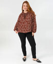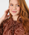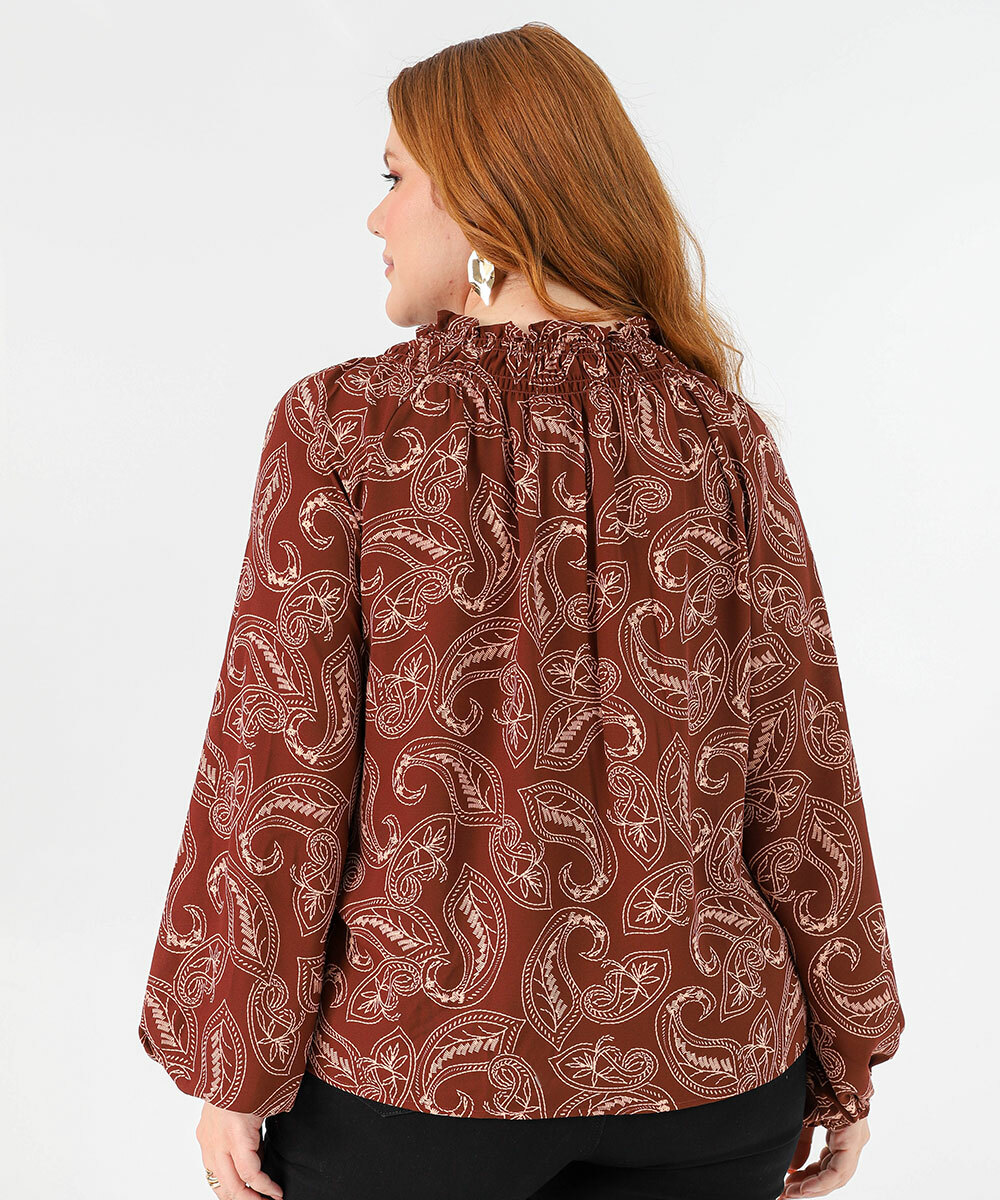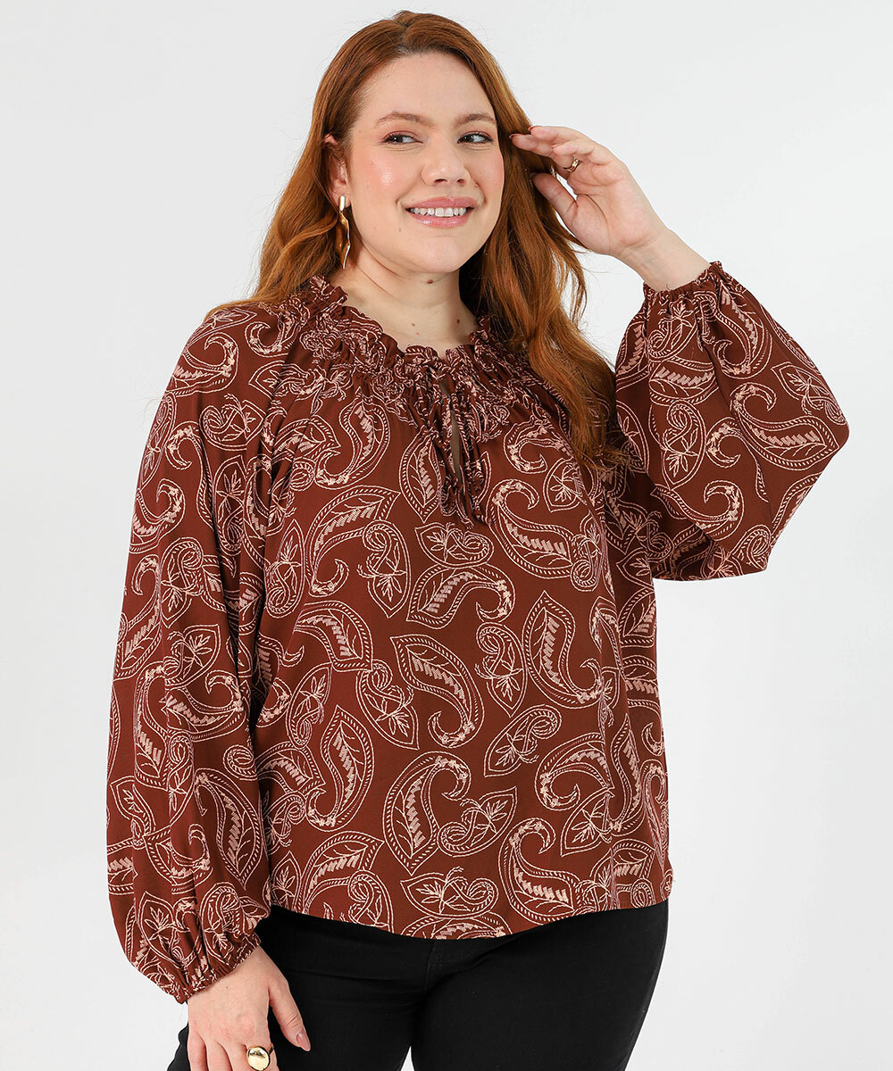 Detalhes: blusa feminina estampada, blusa marrom feminina, blusa manga longa elegante, blusa com amarração feminina, blusa casual chic, moda feminina elegante, blusa estampada moderna