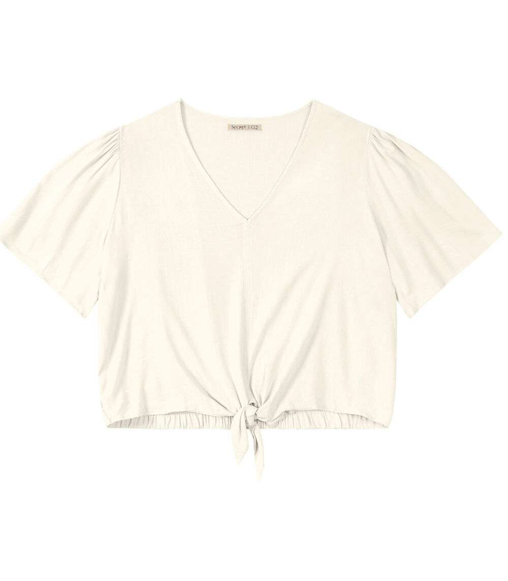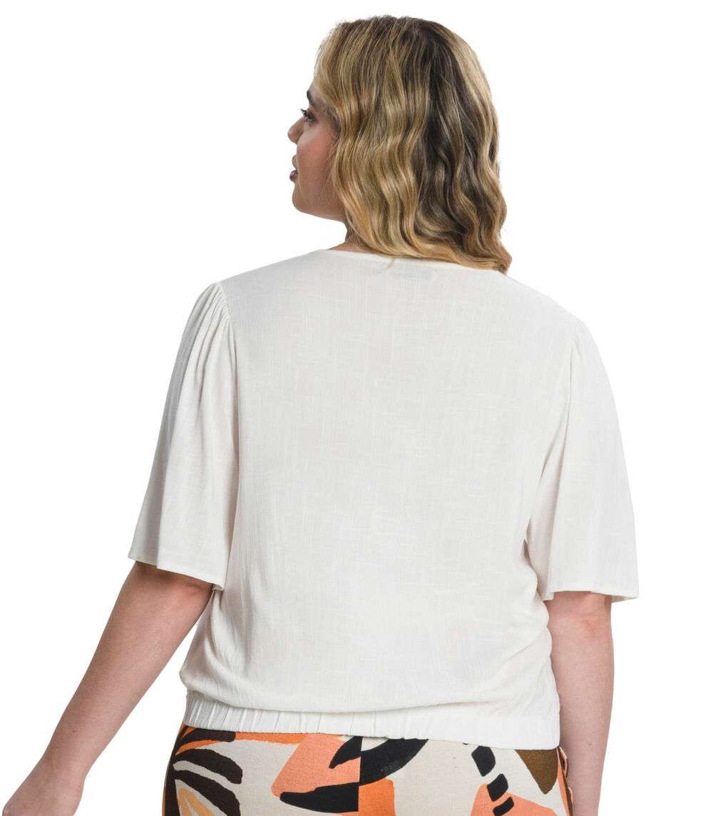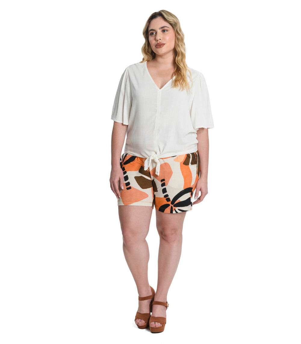 Blusa Feminina Plus Size desenvolvida em Viscose Slub Prime com mangas amplas e decote em V. Possui elástico na barra traseira, e recorte para formação de nó na frente. Peça leve e fresquinha, ideal para os dias quentes! Combine com: shorts e rasteirinha.