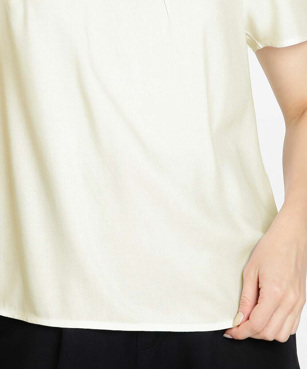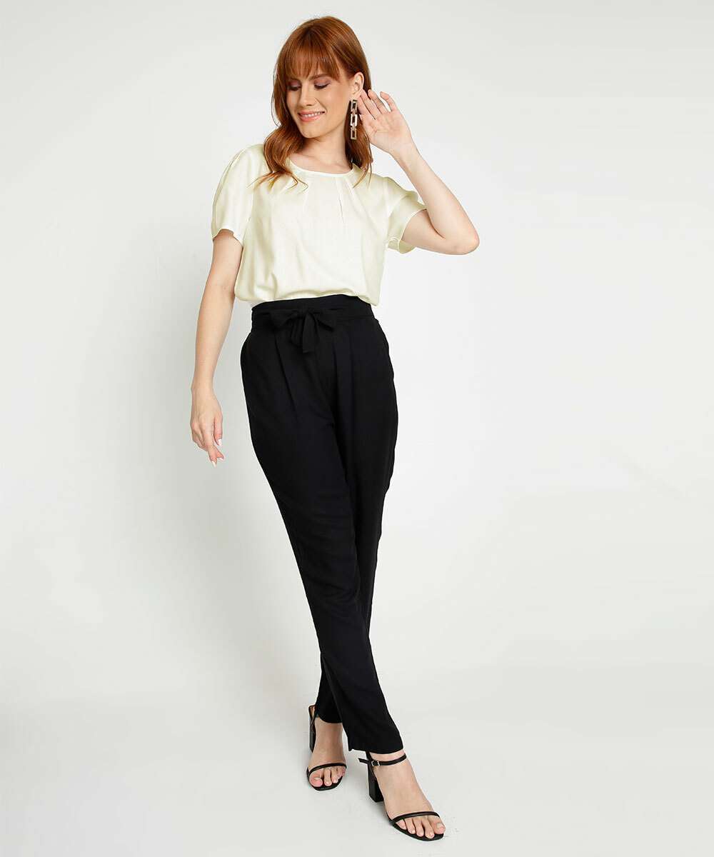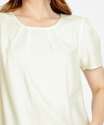 Blusa feminina confeccionada em tecido plano viscose. Possui decote redondo com pregas, manga curta, acabamento e costura no tom.