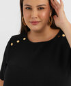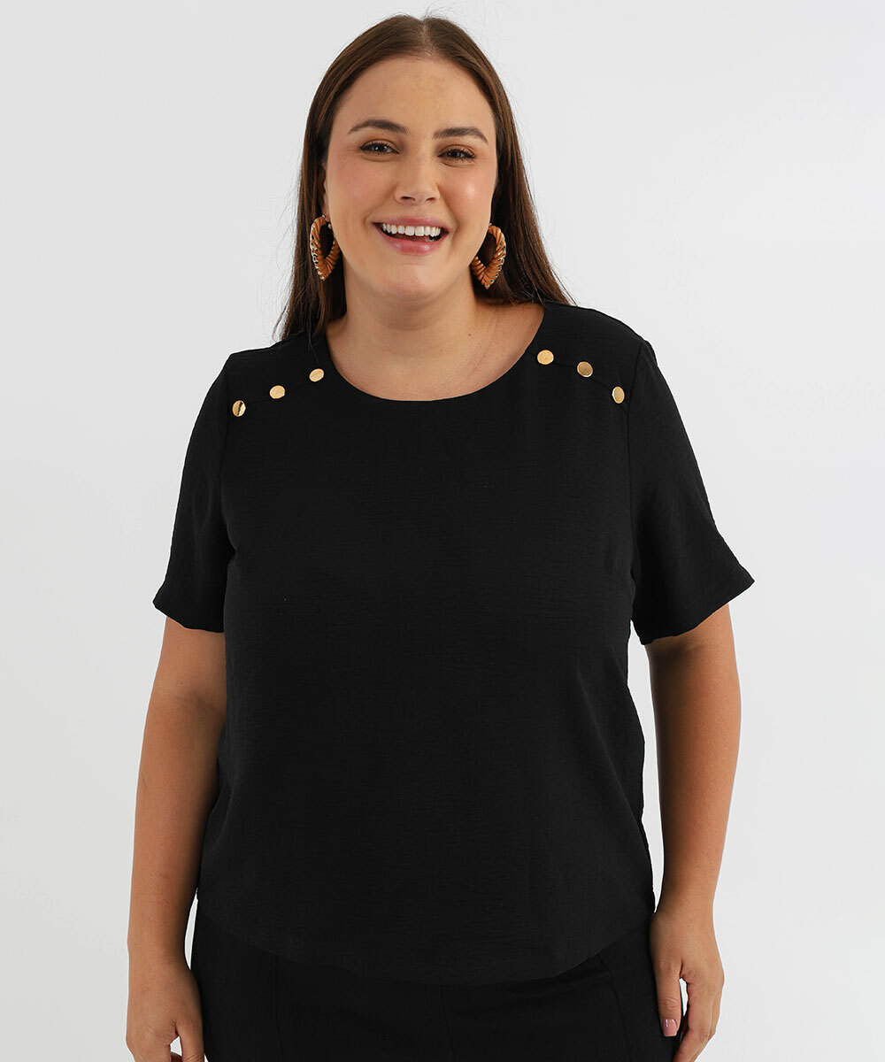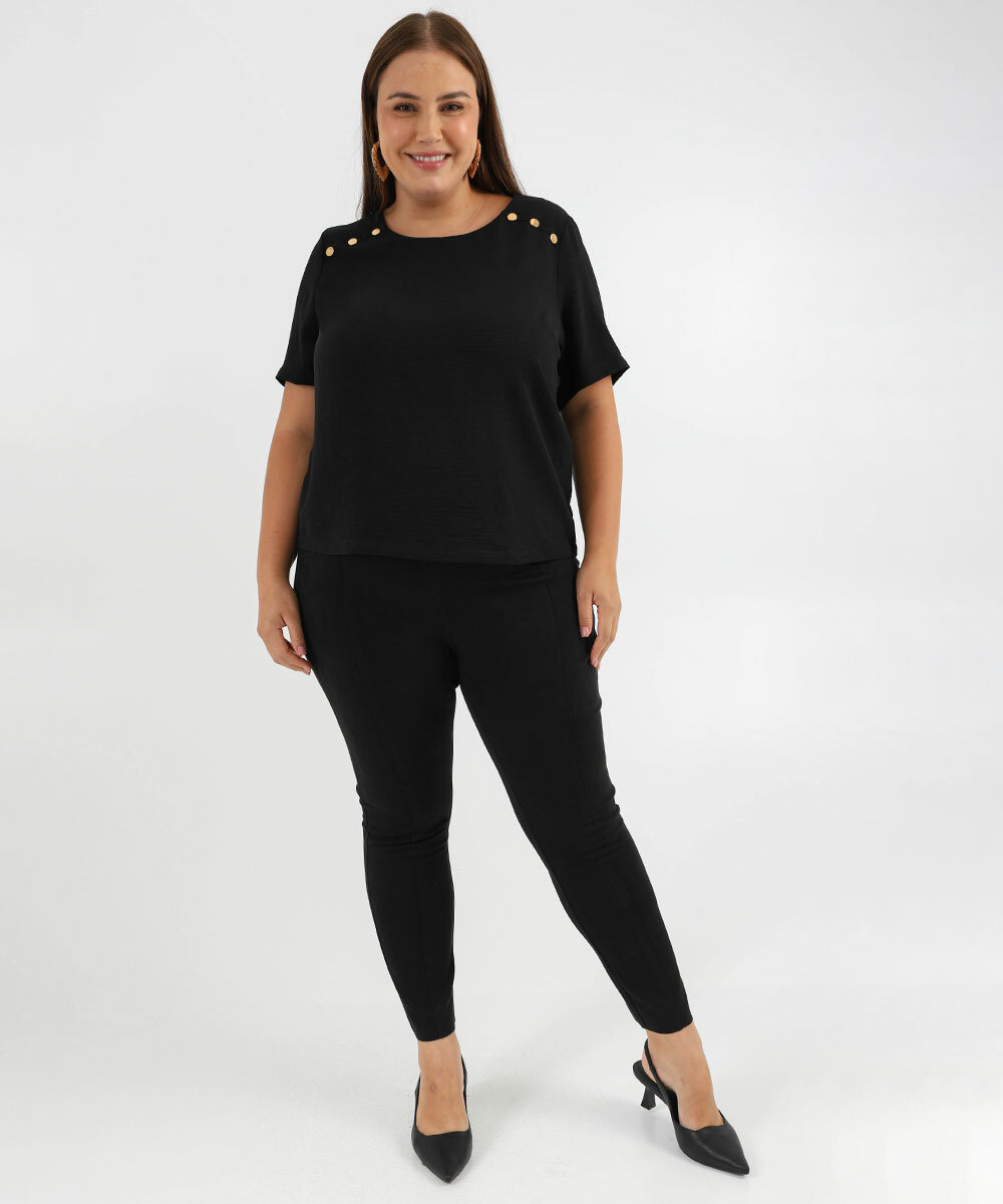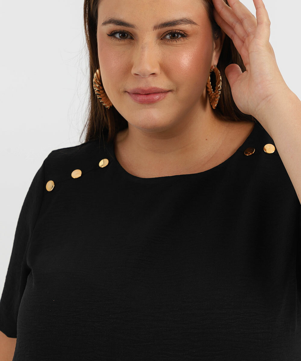 Detalhes: blusa feminina preta, blusa com botões dourados, blusa elegante feminina, blusa casual chic, blusa preta básica feminina, moda feminina elegante, blusa para trabalho feminina