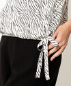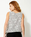 Blusa modelo regata feminina confeccionada em tecido plano viscose. Possui decote V transpassado, tira para amarração na barra, estampa animal print de zebra, fechamento por botão em cima e embaixo, acabamento e costura no tom.