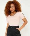Blusa feminina confeccionada em malha viscolycra sustentável. Possui decote v, manag curta vazada, acabamento em viés e costura no tom.