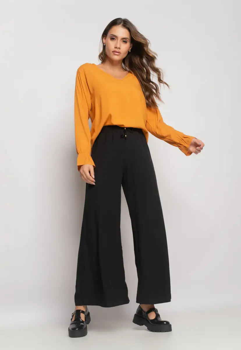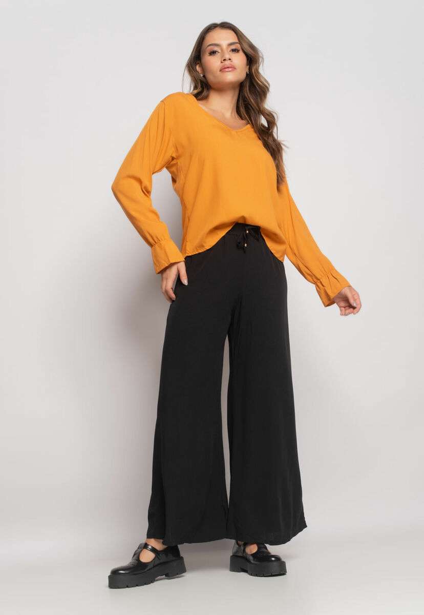 Blusa Gola V Manga Babado Viscolinho Mostarda Salvatore