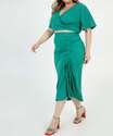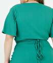 Blusa plus size feminina, modelo cropped, confeccionada em malha canelada. Possui decote v transpassado com amarração, manga curta, acabamento e costura no tom.