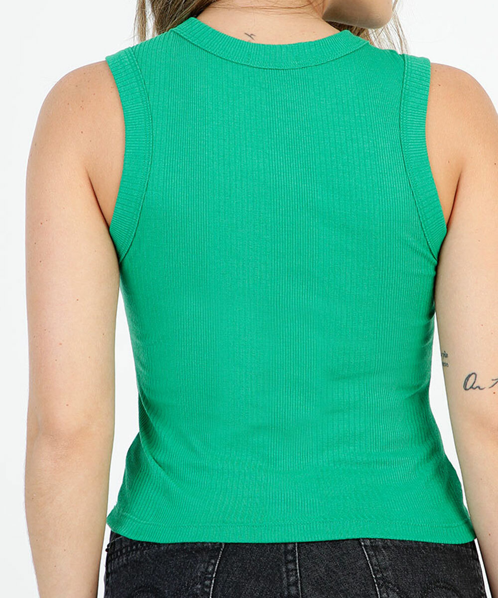 Blusa regata feminina confeccionada em malha canelada. Possui decote redondo, acabamento e costura no tom.