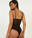 Body sensual confeccionado em tecido renda com recorte em tule. Possui tiras strappy, detalhe vazado com coração metalizado, alças ajustáveis atrás, acabamento e costura no tom.