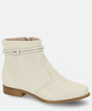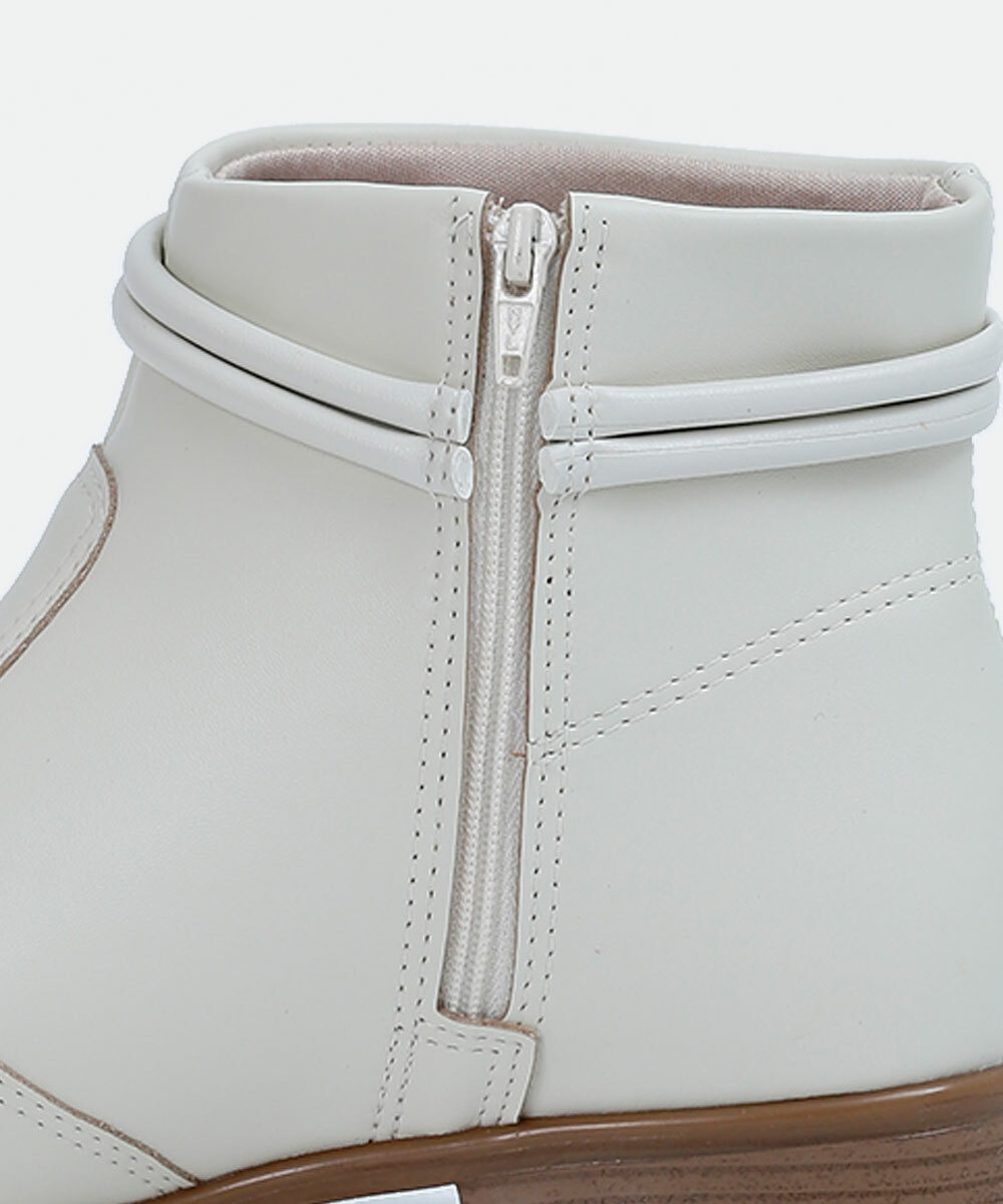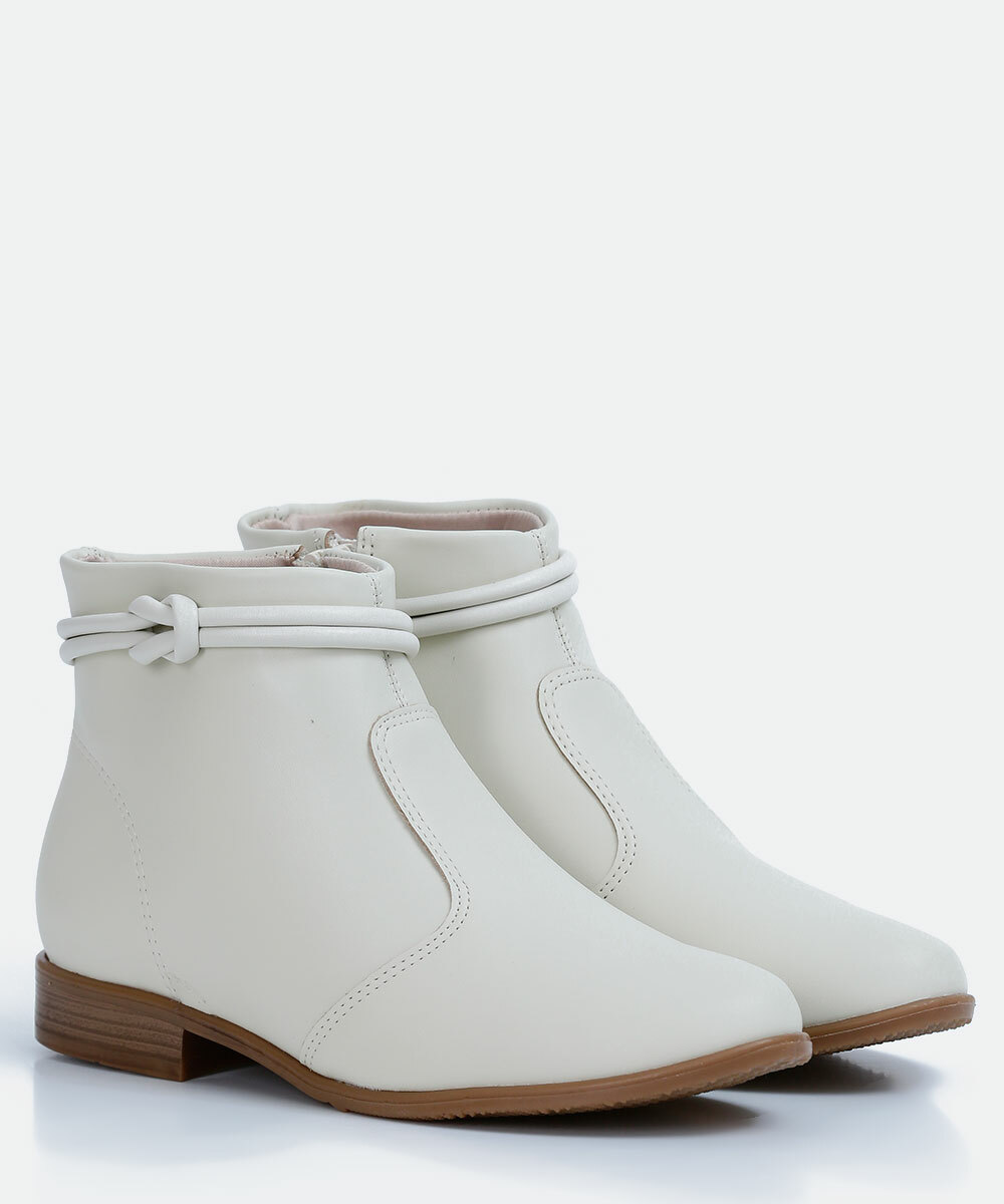 Bota feminina, confeccionada em material sintético, cano curto com tiras decorativas, bico redondo e fechamento por zíper.