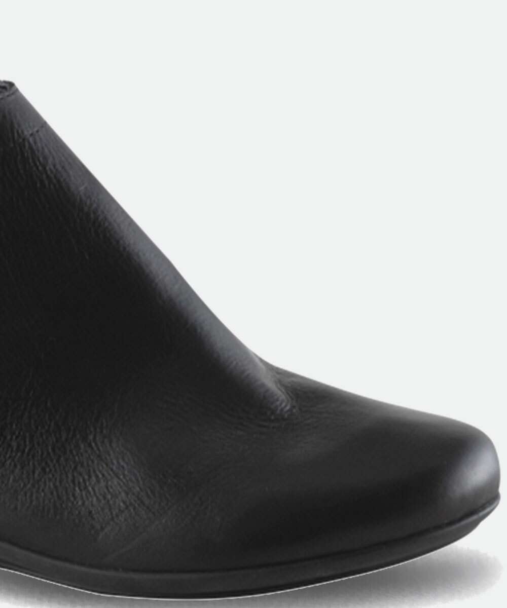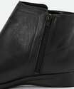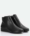 Bota feminina, confeccionada em couro, cano curto, bico redondo e fechamento por zíper.
