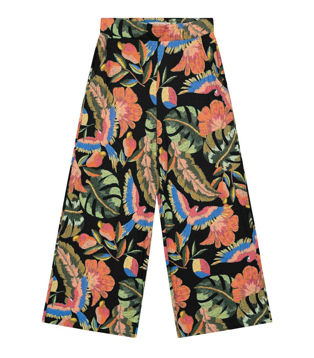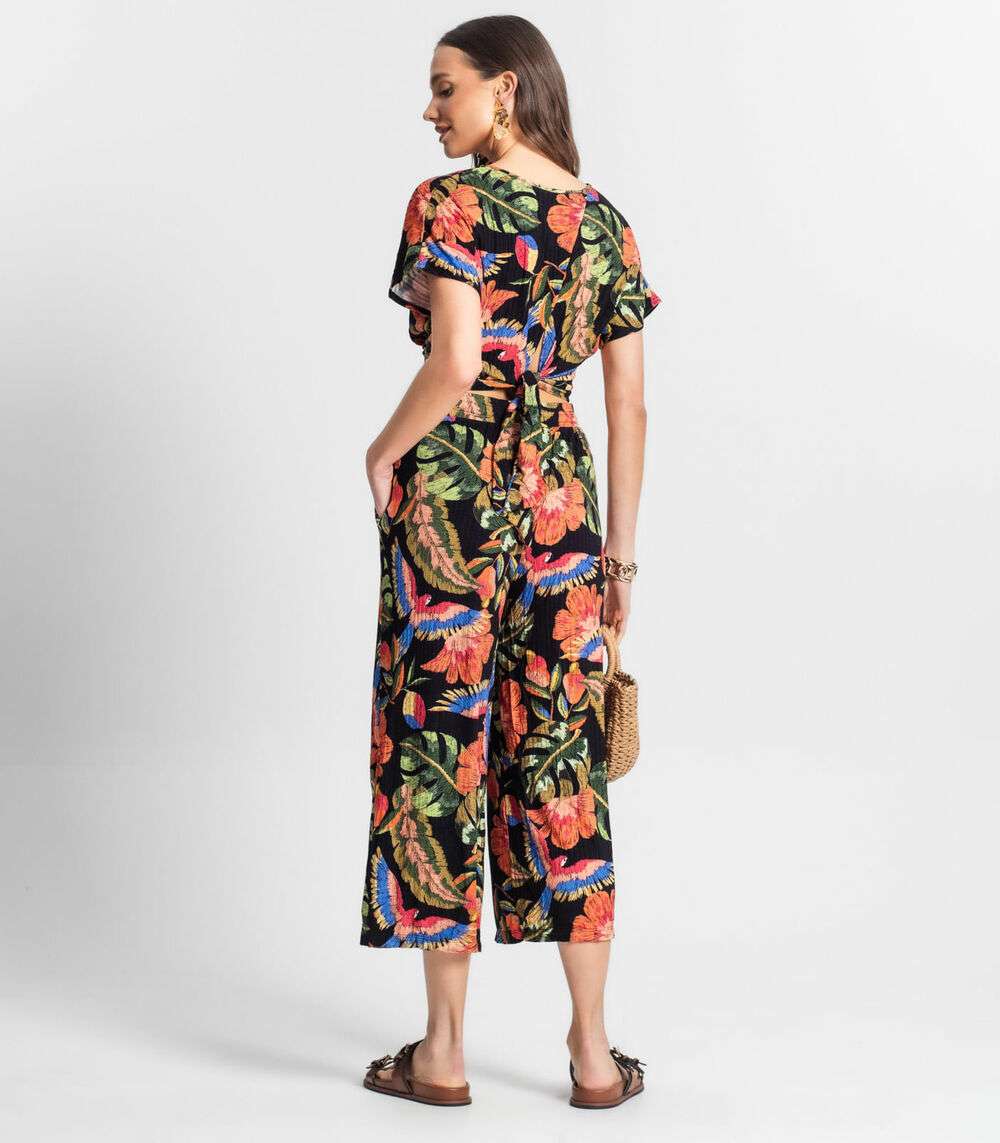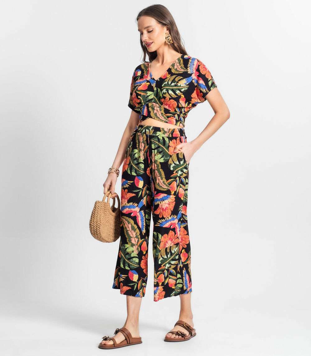 A Calça Feminina Estampada Endless é perfeita para um visual cheio de estilo e conforto. Feita em ribana canelada, destaca-se pela estampa vibrante de folhas e aves, cós talhado com elástico interno para ajuste perfeito e bolsos com pesponto detalhado. Ideal para compor looks descontraídos e modernos.