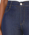 Calça feminina modelo flare, confeccionada em tecido plano jeans. Possui cintura alta, fechamento por botão e zíper no entremeio, cós com passantes, bolso frontal falso e atrás funcionais, acabamento e costura no tom.