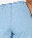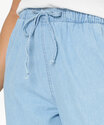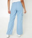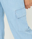 Calça feminina modelo wide leg pantalona, confeccionada em tecido plano jeans. Possui cós elástico, tiras para amarração, bolsos frontais, bolsos cargo na lateral, acabamento no tom e costura contrastante.