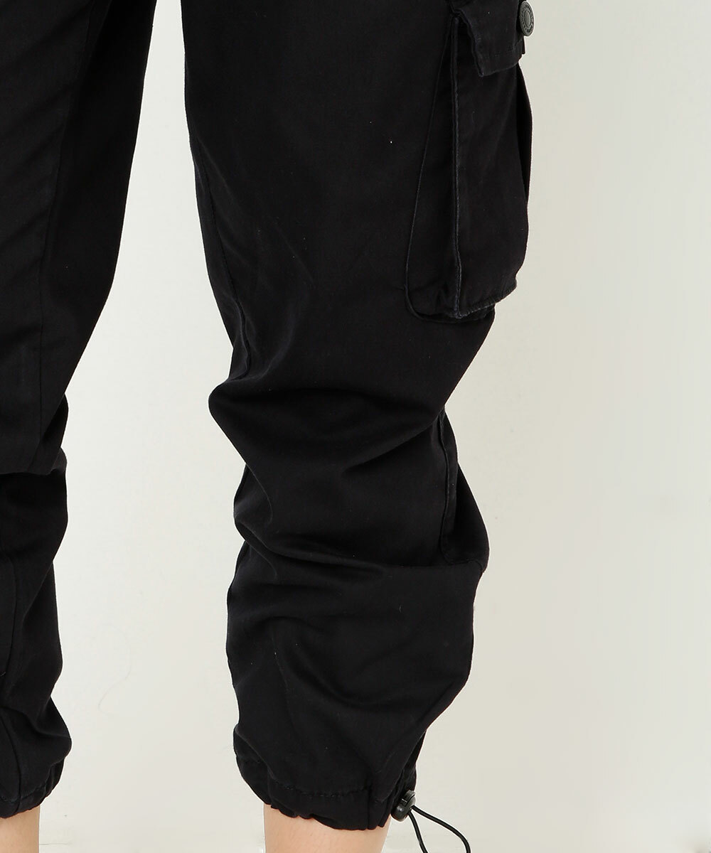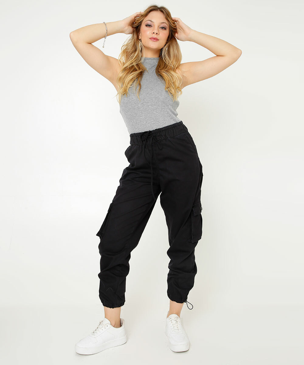 Calça feminina modelo jogger parachute, confeccionada em tecido plano sarja. Possui cós elástico, tiras para amarração, bolsos frontais, bolsos cargo na lateral, barra com elástico, acabamento e costura no tom.
