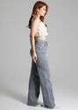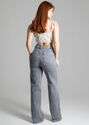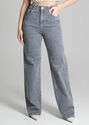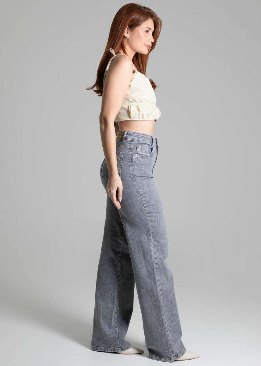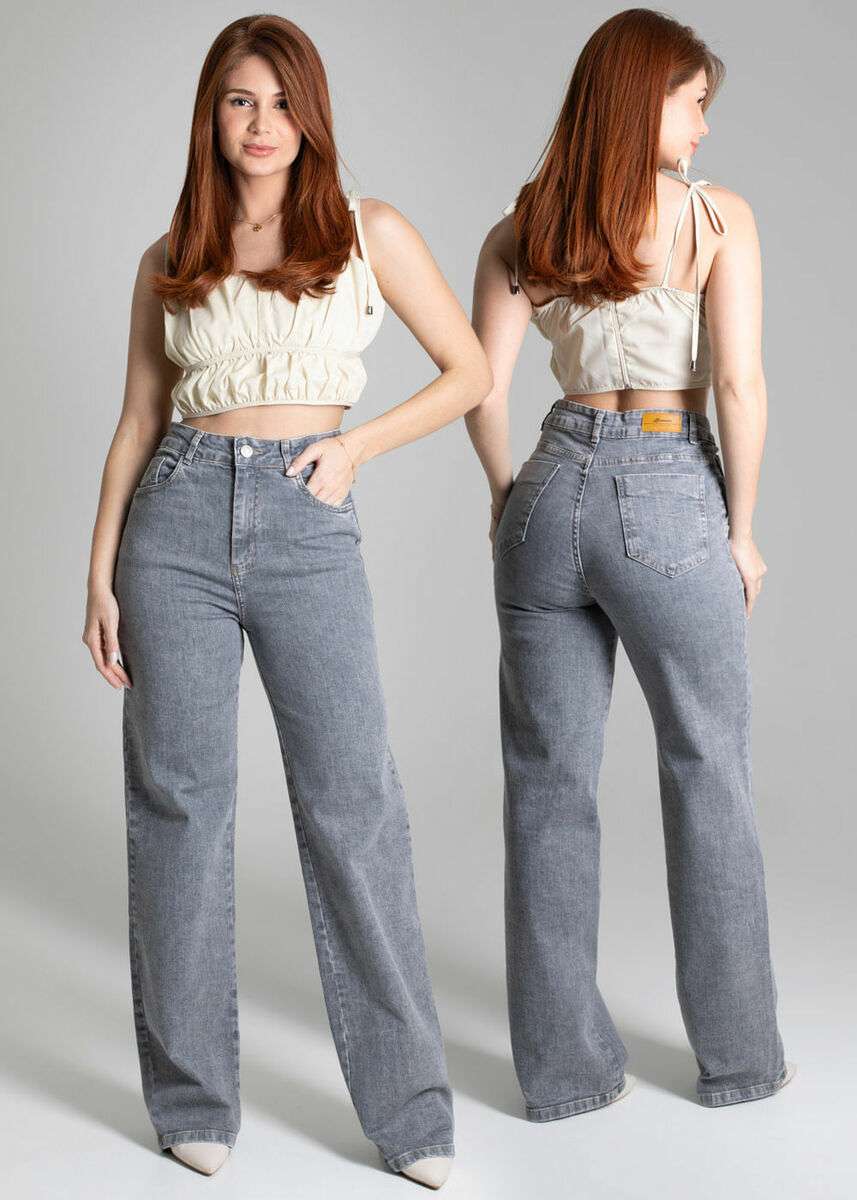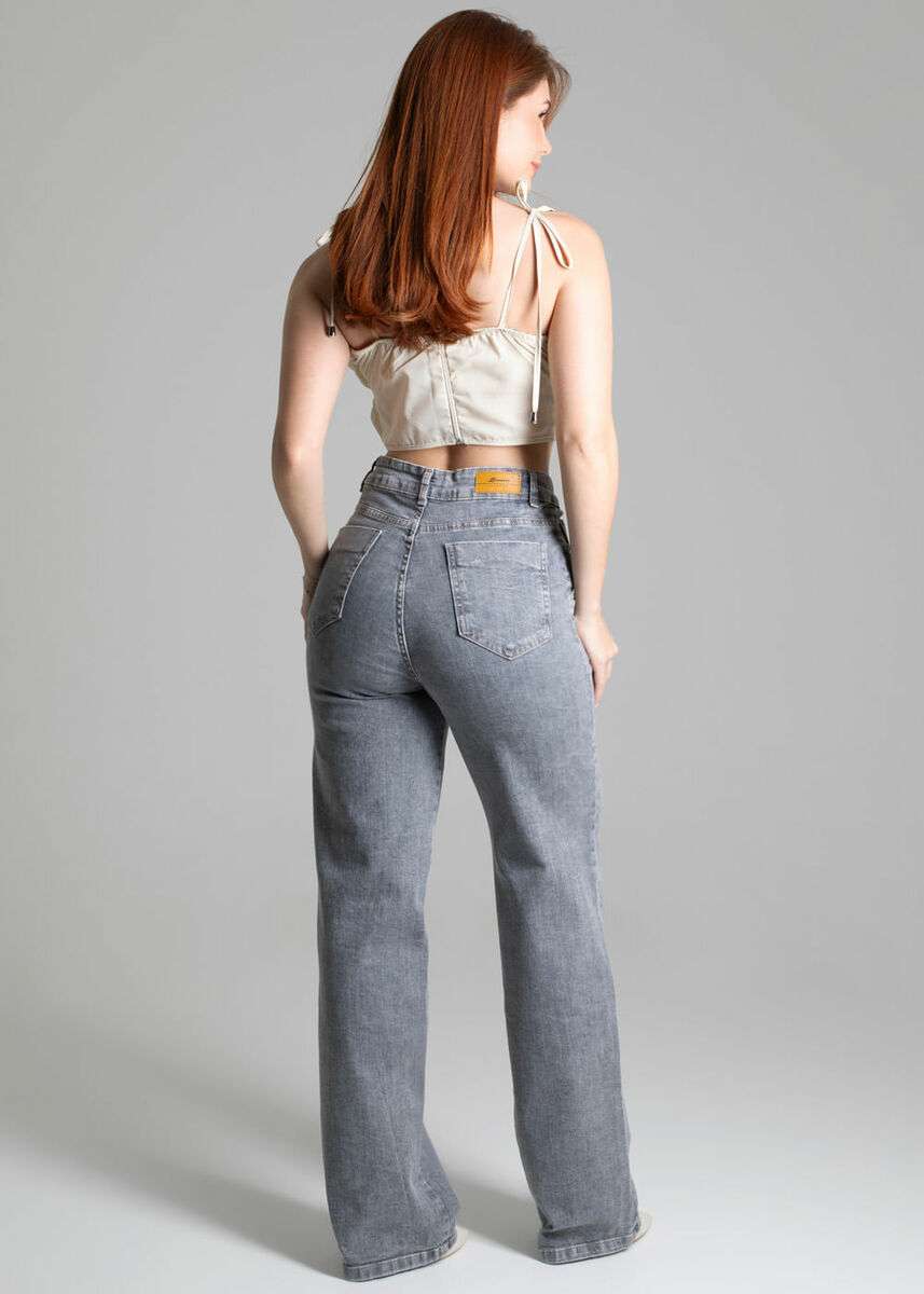 Calça feminina confeccionada em jeans. O modelo possui cintura super alta, gancho no lugar e caimento amplo da coxa até a barra. Cintura alta Fechamento através de um botão e zíper Bolsos frontais e posteriores funcionais Barra simples Tecido: Jeans Tipo de Lavagem: color Cor: cinza