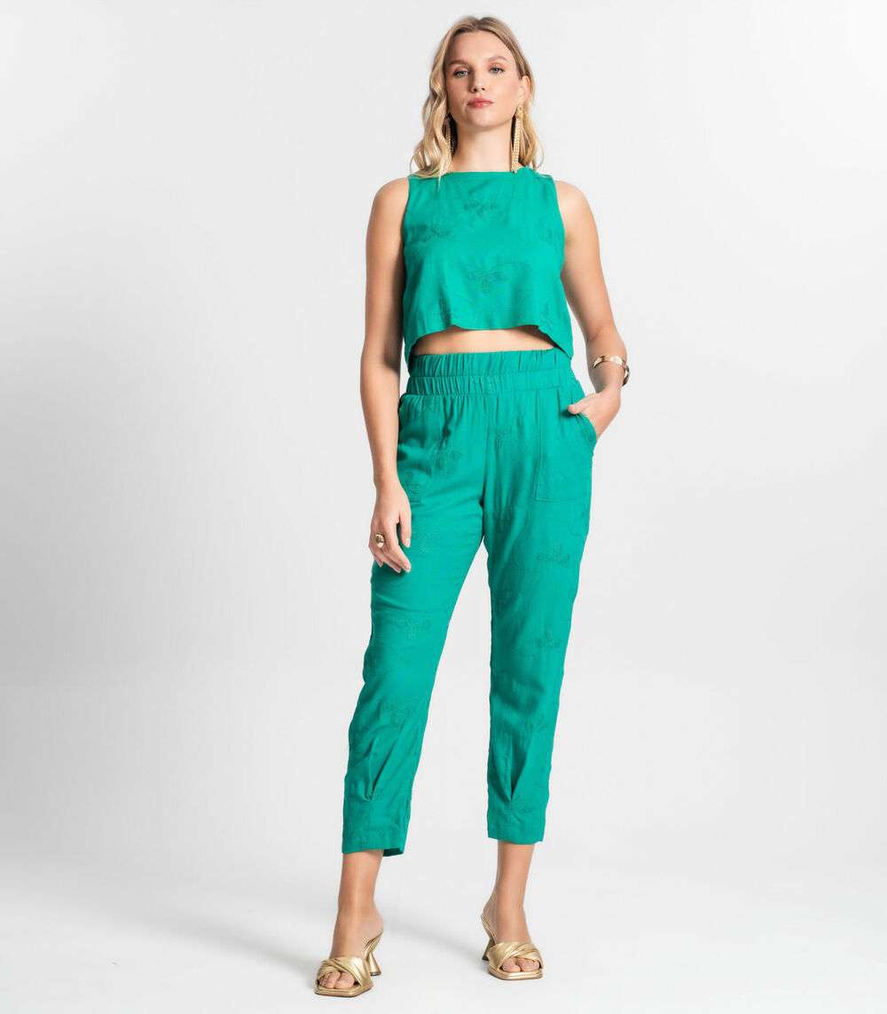 A Calça de Linho Feminina Endless combina elegância e conforto. Feita em linho bordado, possui cós talhado com elástico para ajuste perfeito e bolsos funcionais. Ideal para um visual sofisticado e prático em todas as ocasiões.