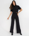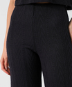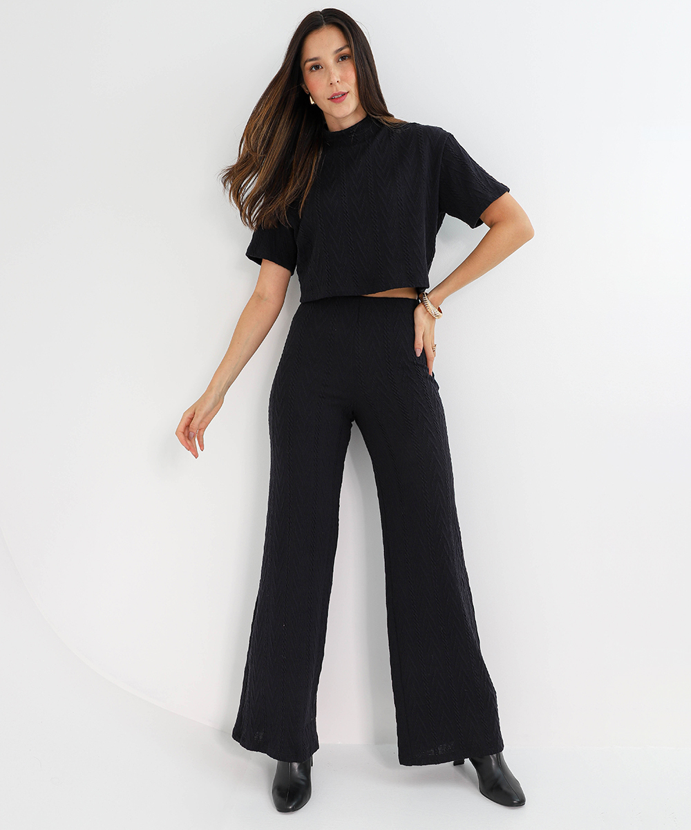 Detalhes: calça pantalona preta, calça feminina elegante, calça ampla feminina, calça texturizada feminina, pantalona moderna feminina, moda feminina sofisticada, calça preta feminina