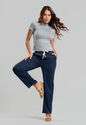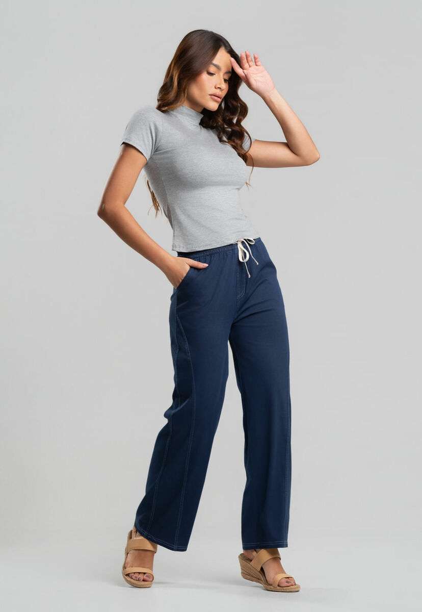 A calça jeans une conforto e estilo em uma peça versátil que vai do casual ao elegante com facilidade. Confeccionada em tecido leve e macio, possui modelagem reta que valoriza a silhueta sem abrir mão da liberdade de movimento.A cintura com elástico embutido e cordão ajustável garante um caimento perfeito, enquanto os bolsos laterais funcionais acrescentam praticidade ao visual. Combine com regatas, camisas ou blusas mais soltinhas e crie looks confortáveis e cheios de estilo — perfeitos para o dia a dia, trabalho ou momentos de lazer. • Compressão localizada que valoriza as curvas • Cós firme com sustentação ideal • Bolsos laterais funcionais • Tecido leve e confortável Modelo veste tamanho P. Medidas da modelo: Altura 1,73cm | Busto 86cm | Cintura 67cm | Quadril 99cmComposição: 90% Poliéster, 4% Elastano.