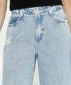 Calça feminina, modelo wide leg pantalona, confeccionada em tecido plano jeans com detalhes destroyed. Possui fechamento por botão e zíper no entremeio, cós com passantes, bolsos frontais e atrás, acabamento no tom e costura contrastante.