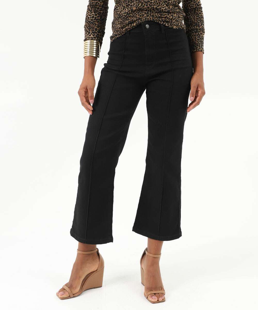 Calça Jeans Reta Feminina Bolsos Preto