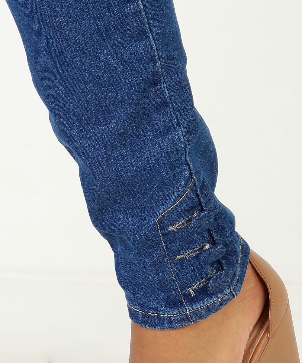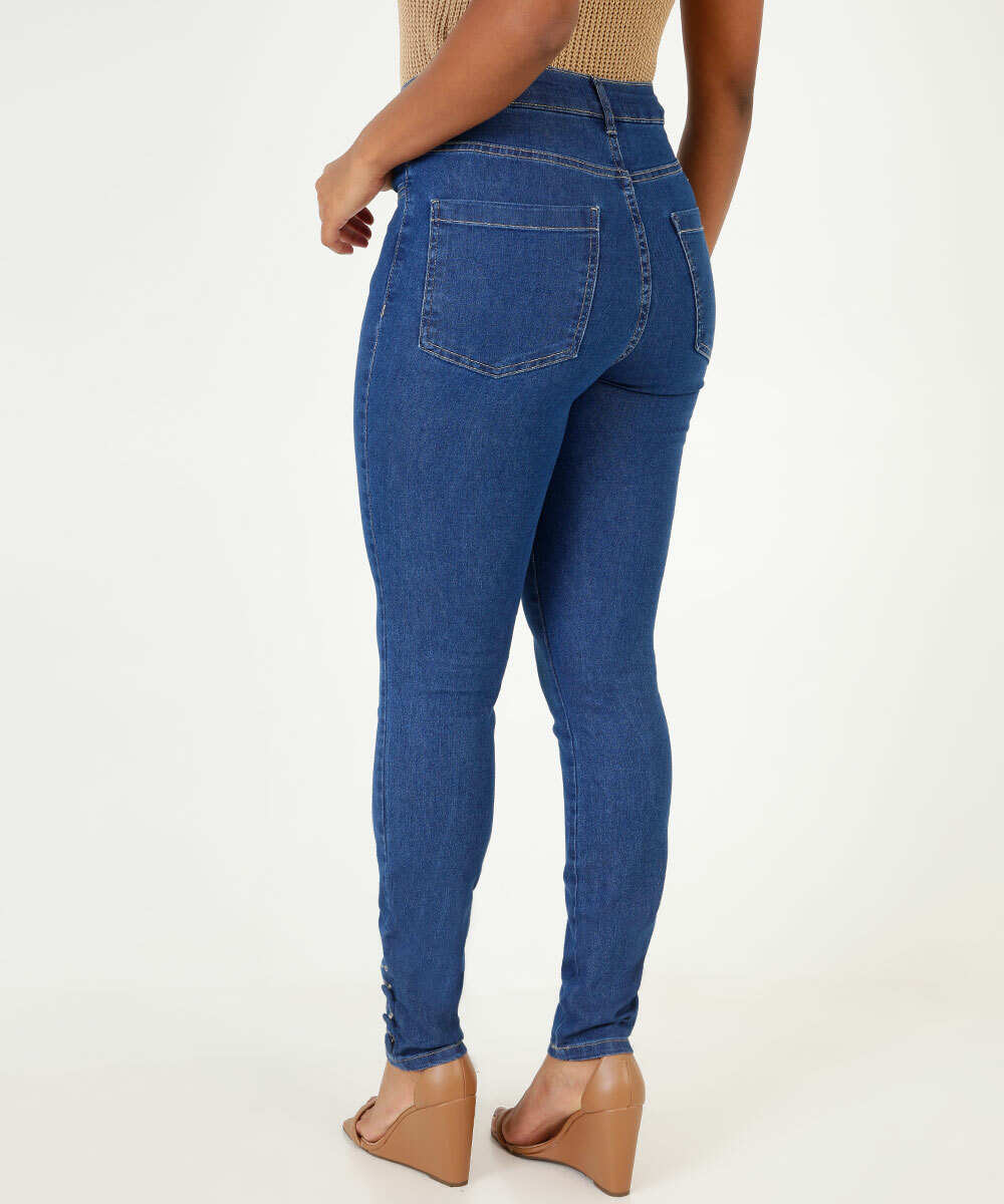 Calça feminina, modelo skinny, confeccionada em tecido plano jeans. Possui cós com passantes, fechamento por botão e zíper no entremeio, bolsos frontais e atrás funcionais, barra com botões decorativos, acabamento e costura no tom.
